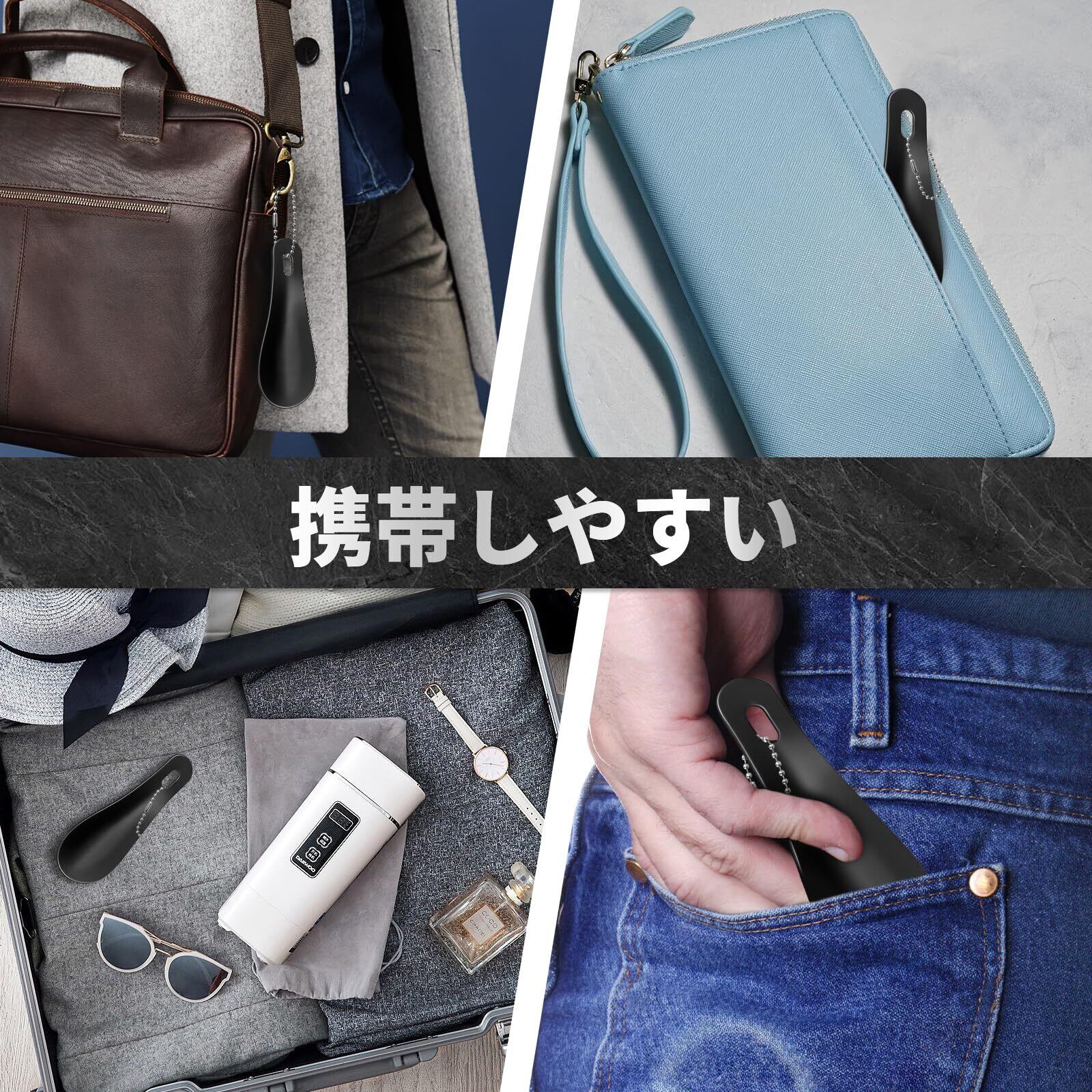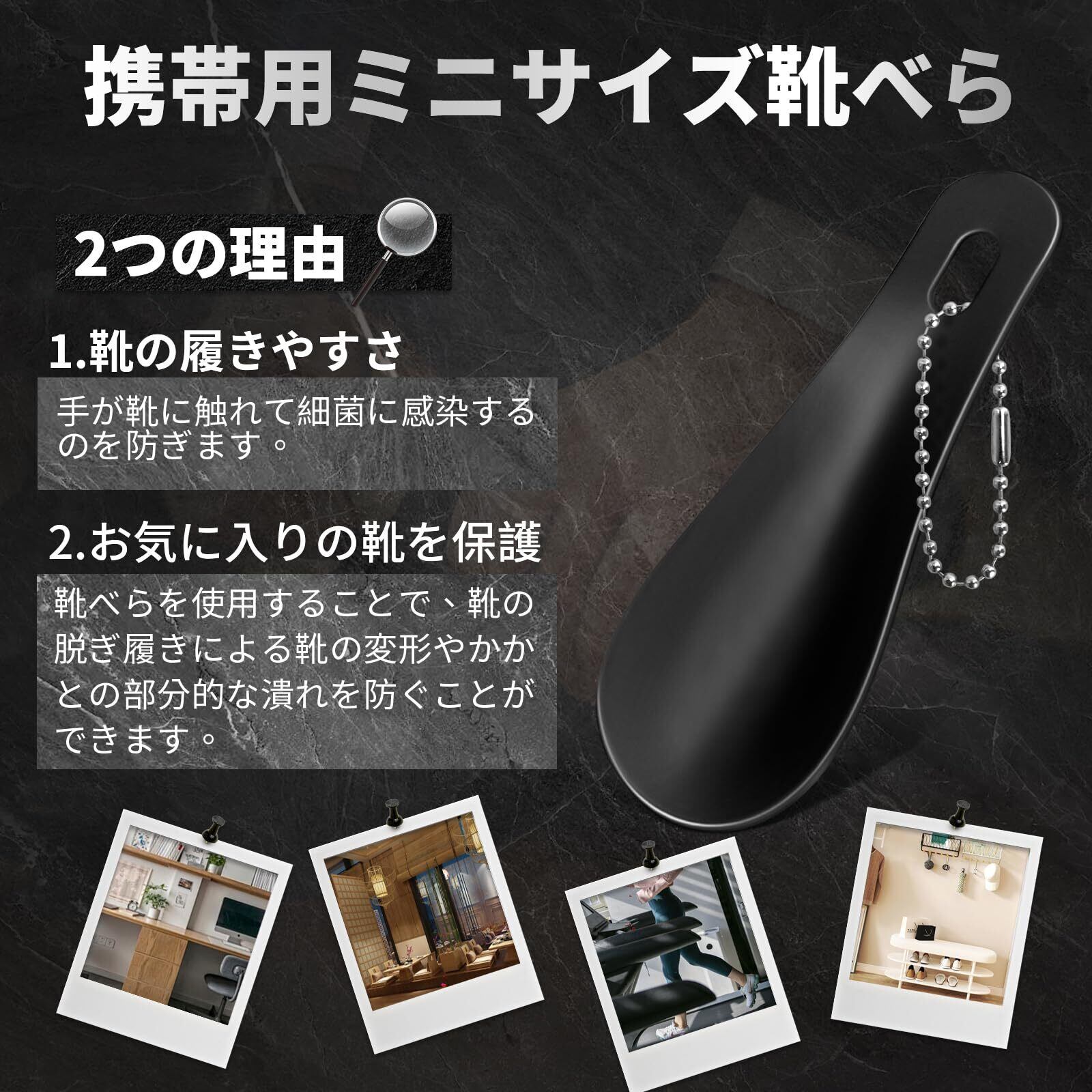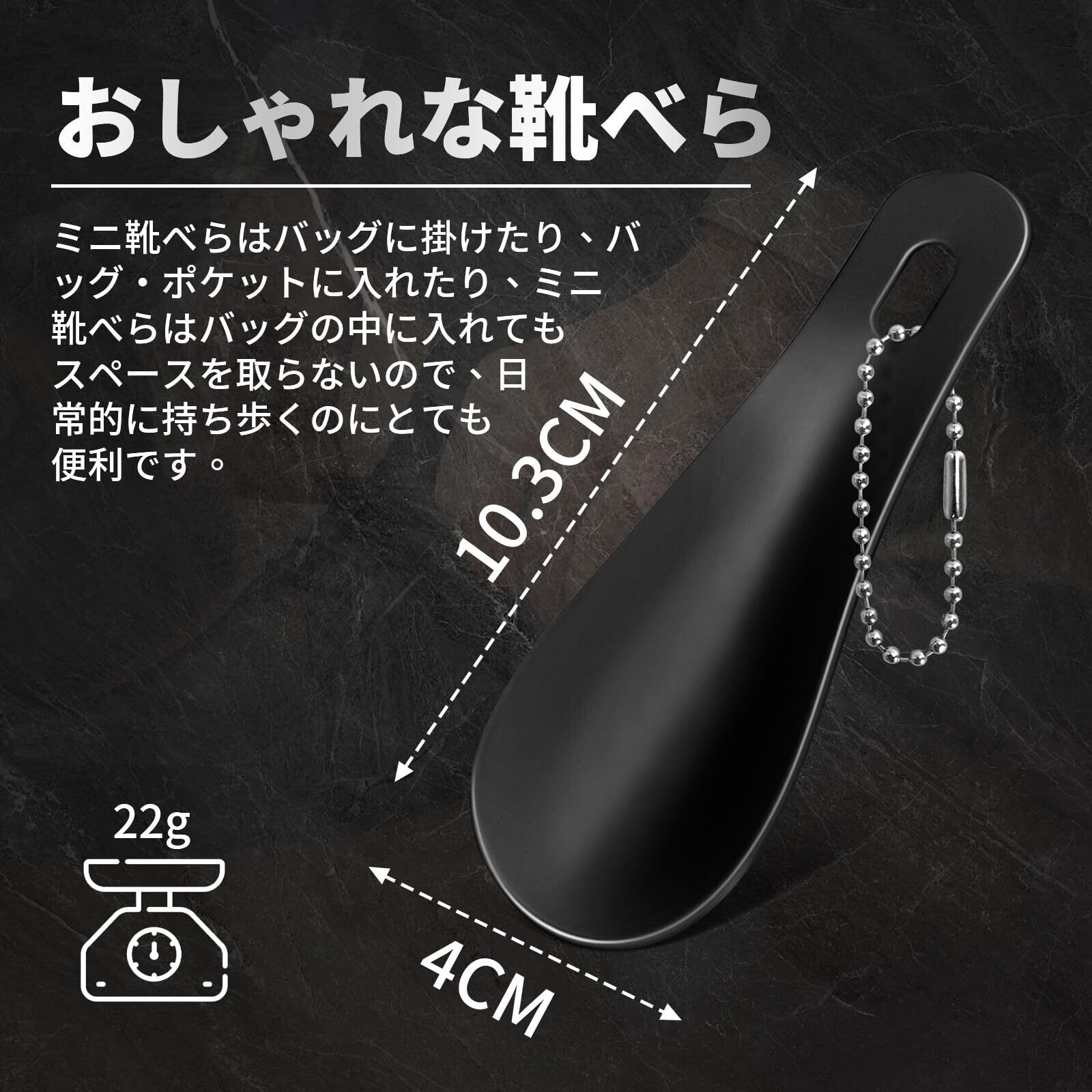 【コンパクト】サイズ:10×4cm、重さは22.5g。 キーホルダー付きで、バッグに掛けたり、バッグ・ポケットに入れたり、ミニ靴べらはバッグの中に入れてもスペースを取らないので、日常的に持ち歩くのにとても便利です。