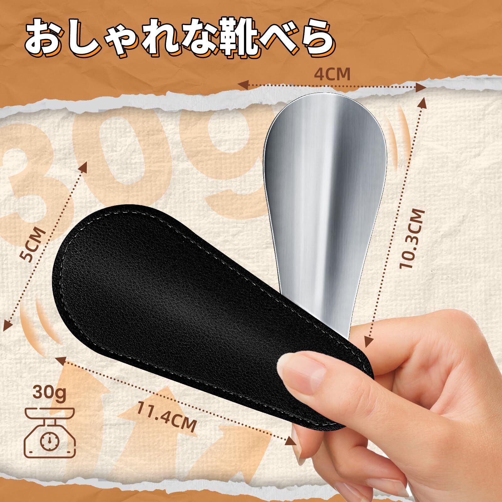【コンパクト】靴べらサイズ:11.4×5×0.3cm、重さは30g。 バッグ・ポケットに入れたり、ミニ靴べらはバッグの中に入れてもスペースを取らないので、日常的に持ち歩くのにとても便利です。
