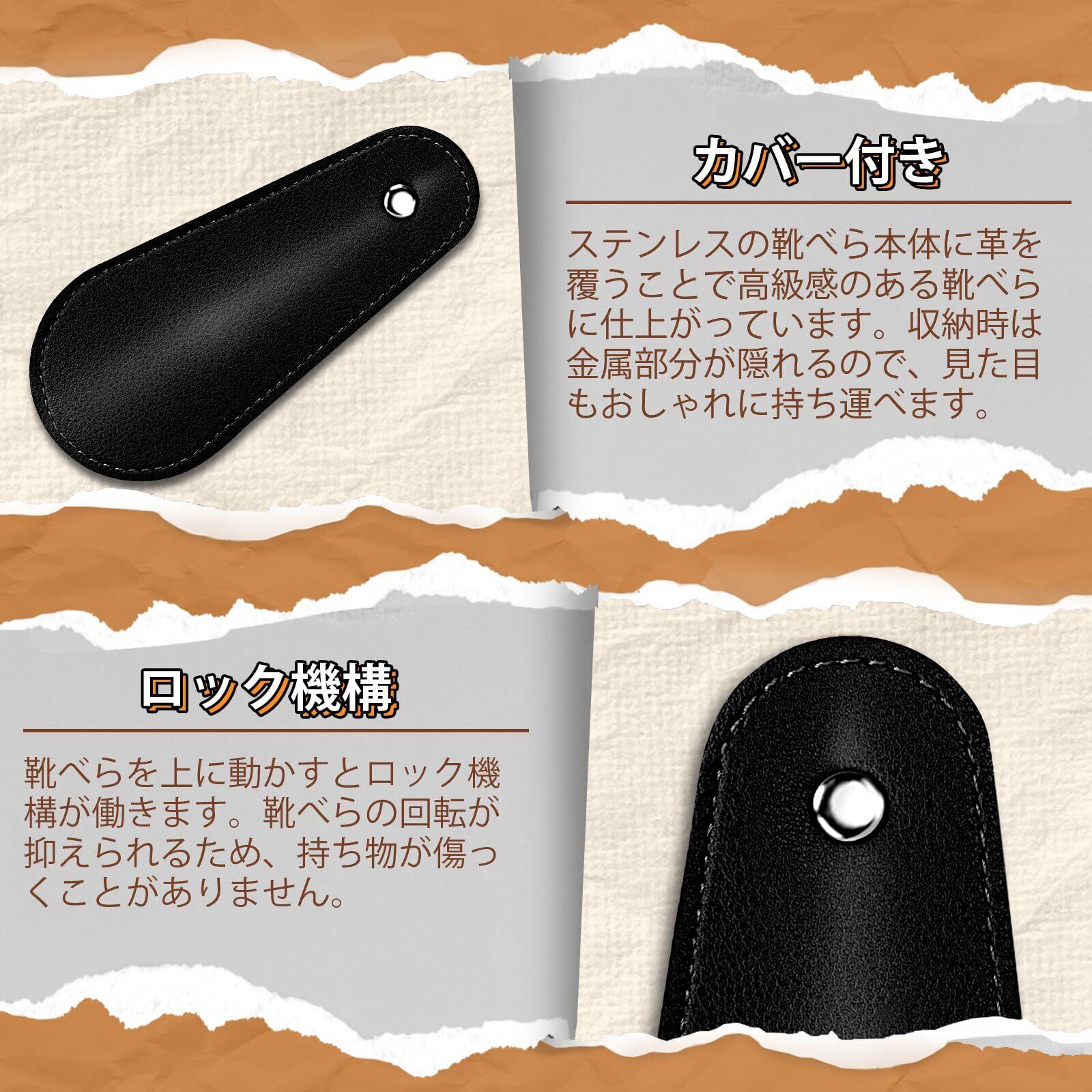 【実用性抜群】ステンレスの靴べら本体に革を覆うことで高級感のある靴べらに仕上がっています。PUカバーが付きで、靴べらを上に動かすとロック機構が働きます。靴べらの回転が抑えられるため、収納時は金属部分が隠れるので、持ち物が傷っくことがありません。見た目もおしゃれに持ち運べます。