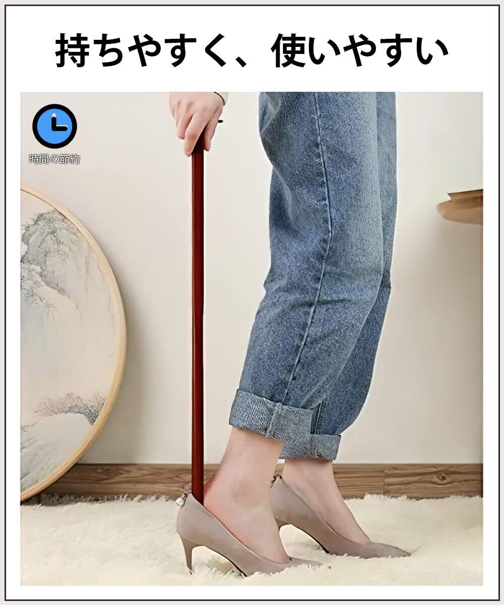 【靴の便利な履ける】:足を靴の中に半分を入って、靴べらをかかとの後ろに、まっすぐ靴の中に差し込んください。靴べらの力で足を全部靴の中に入ってから、靴べらを出します。