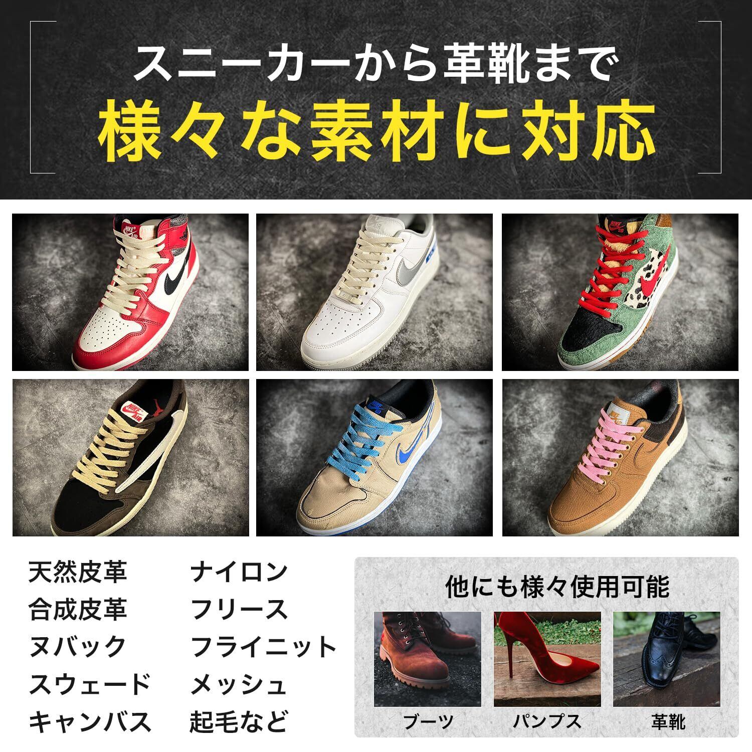【様々な靴に対応】スニーカー・革靴・ブーツ・パンプスなどの様々な靴や、天然皮革・合成皮革・レザー・スエード・ヌバック・キャンバス・ナイロン・フリース・フライニット・メッシュ・起毛など複数素材に対応可能です。