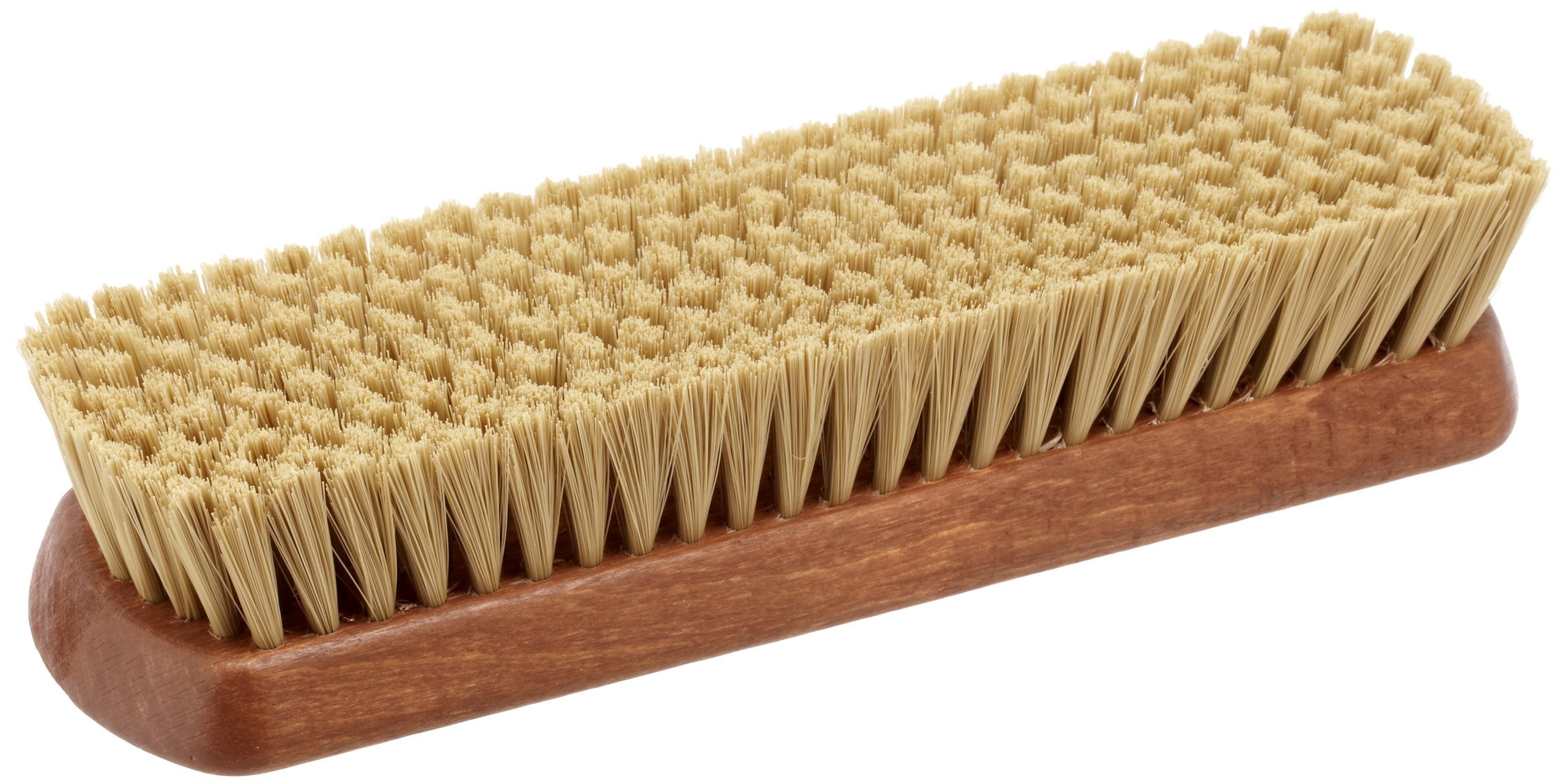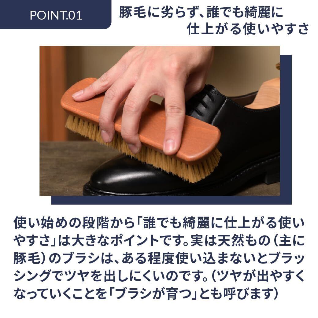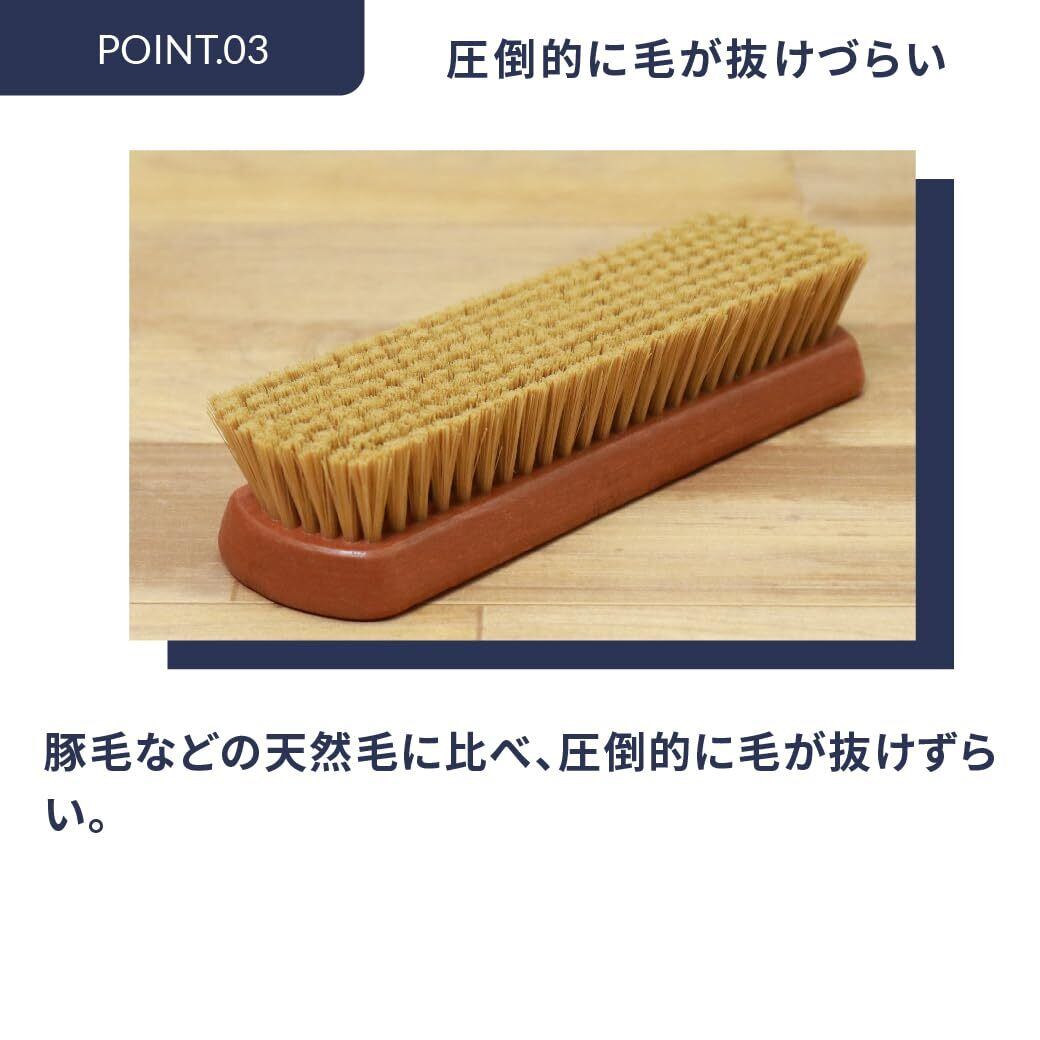 靴クリームを塗った後、クリームを伸ばしたり、なじませたりする→かたい毛(強い毛)が最適です! クリームを靴になじませ、伸ばすことにより光沢もでます。コシがある化繊毛は長く使えてしっかりと靴に光沢感を与えます。プロは毛がしっかりとしていて少し硬めの化繊毛を使用しています。その最大の特長は靴クリームを塗った後にクリームを全体に伸ばしたり、皮革に馴染ませたりするときの使い勝手の良さにあるのです。握りやすさと小さくなく、大きくもないジャストサイズも人気の秘密です。プロブラックブラシは黒クリーム用、プロホワイトブラシは茶系用など、ブラシで色分けができるようになりましたので色違いで是非どうぞ! ! ドイツ製・イタリア製も選べるようになりました。同サイズ・同様の化繊毛で、柄の部分の色が黄土色(ドイツ製)と赤茶色(イタリア製)の違いがありますが仕上げ用ブラシとしては両者とも同等のクオリティです。 ■用途:スムースレザー(一般的な表革)の靴、パンプス、ブーツ■毛の種類:化繊毛■サイズ:183mm×50mm 毛の長さ約25mm■原産国:ドイツ製またはイタリア製