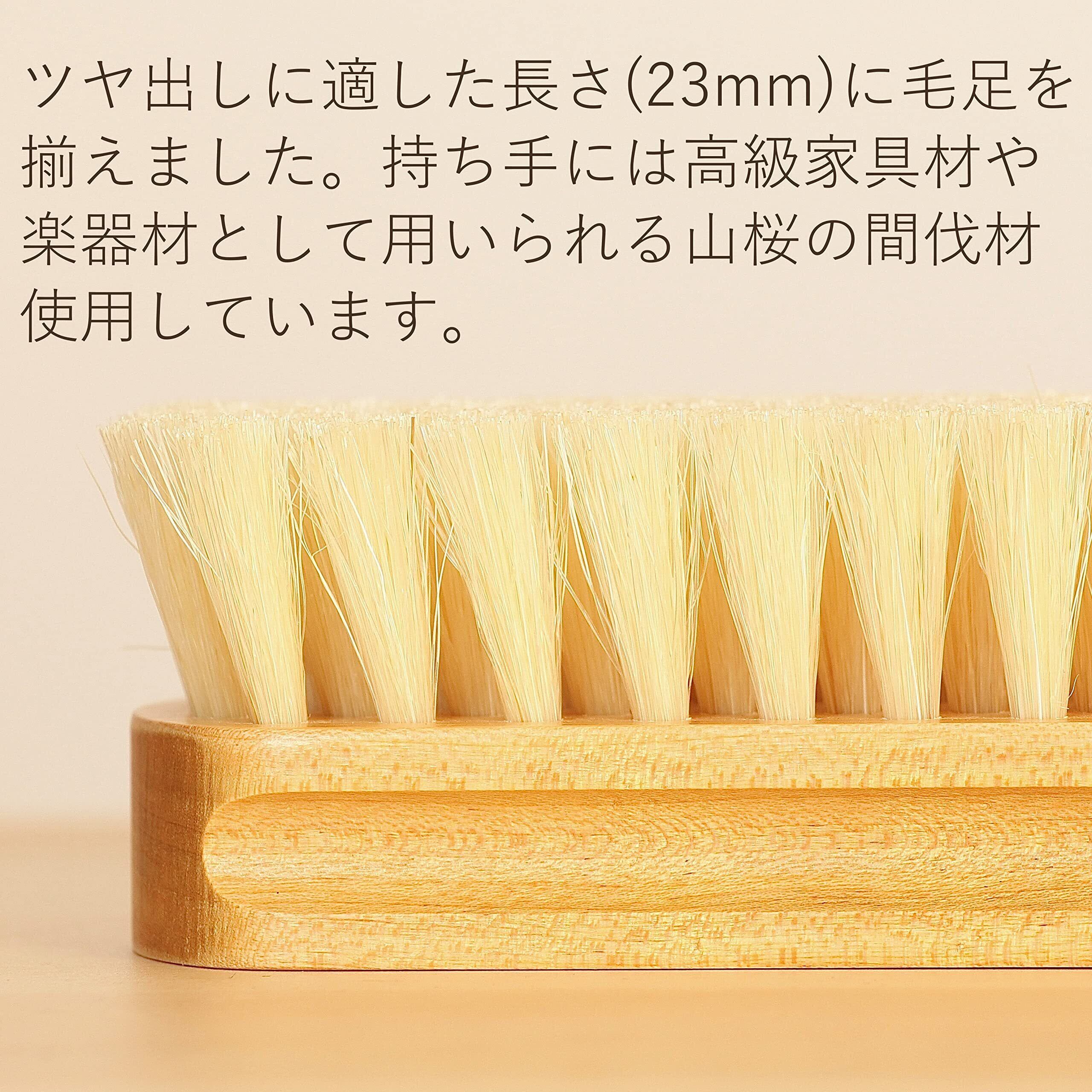 日本製。ツヤ出しに最適な豚毛ブラシです。持ち手部分は高級家具材や楽器材としても用いられる、山桜の間伐材を使用しています。■本体サイズ:約17cmx約5cm(持ち手手部分)毛足約2.3cm