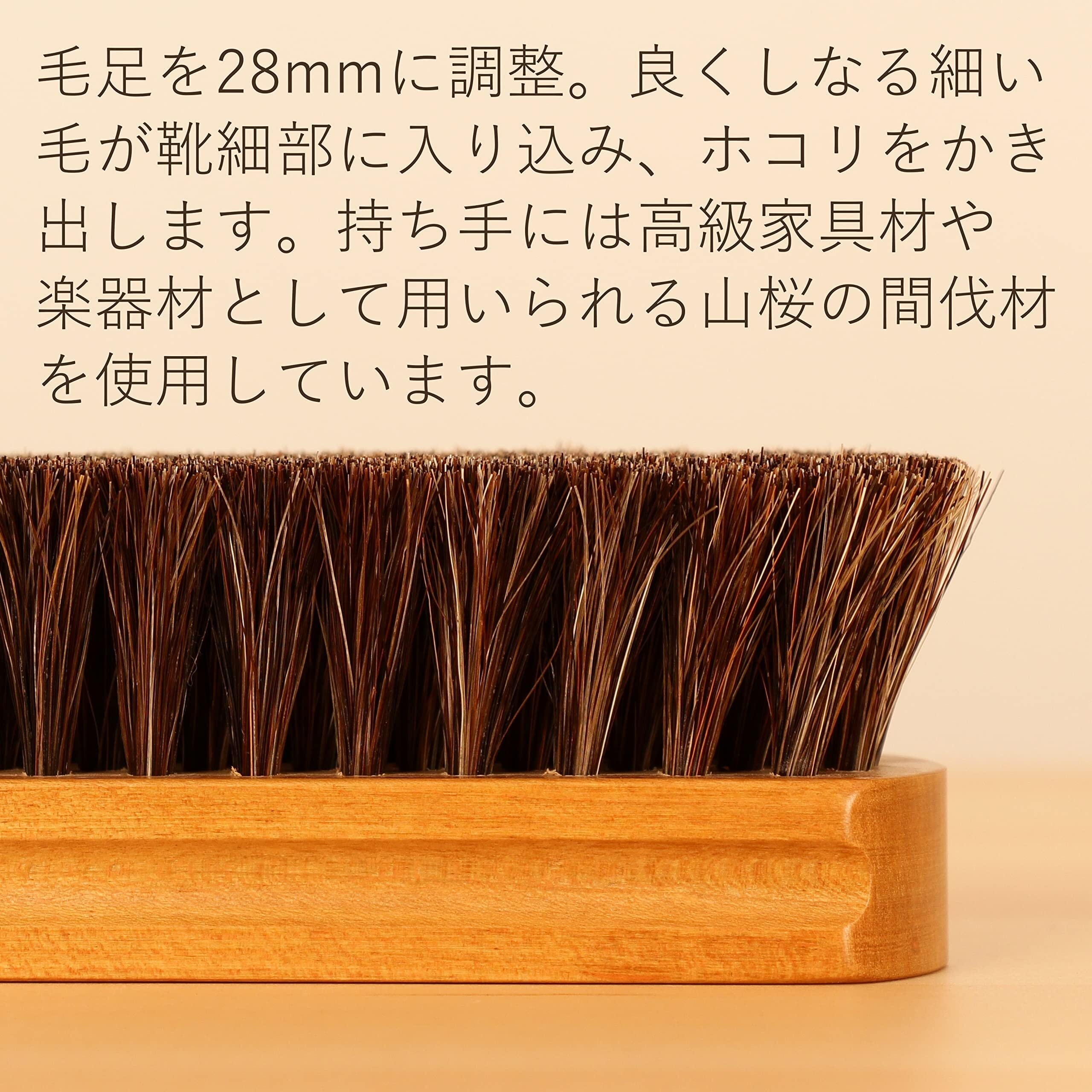 日本製。ホコリ落としに最適な馬毛ブラシです。持ち手部分は高級家具材や楽器材としても用いられる、山桜の間伐材を使用しています。■本体サイズ:約17cmx約5cm(持ち手部分)毛足約2.8cm