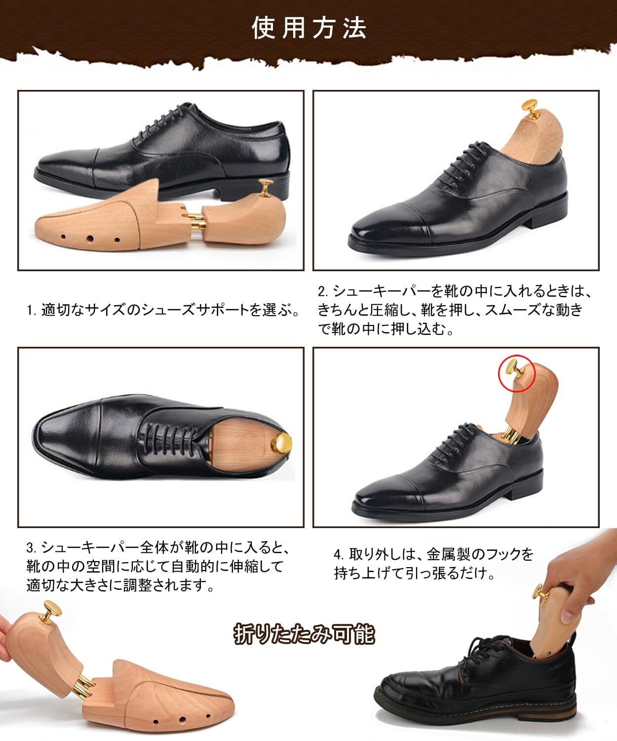 【スプリングテクノロジー】このシューツリーは、ユニークなダブルパイプデザインとバネ技術を採用しており、前後に2センチの伸縮が可能で、適度なテンションを鞋内にかけて靴のしわを滑らかにし、伸ばします。これにより、靴の形状が変わるのを効果的に防ぎます。