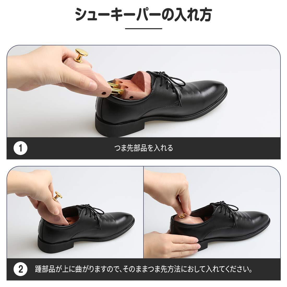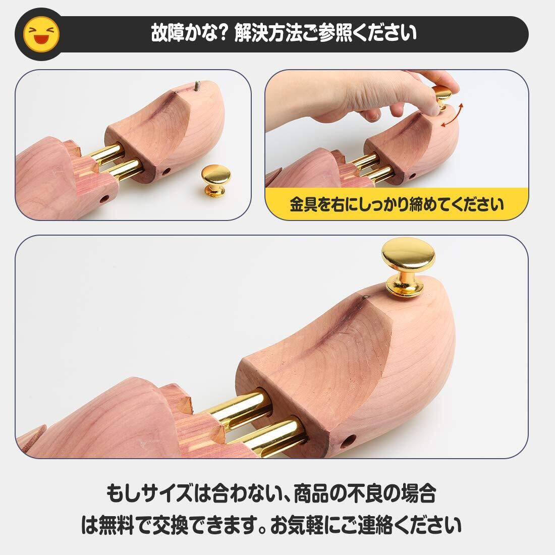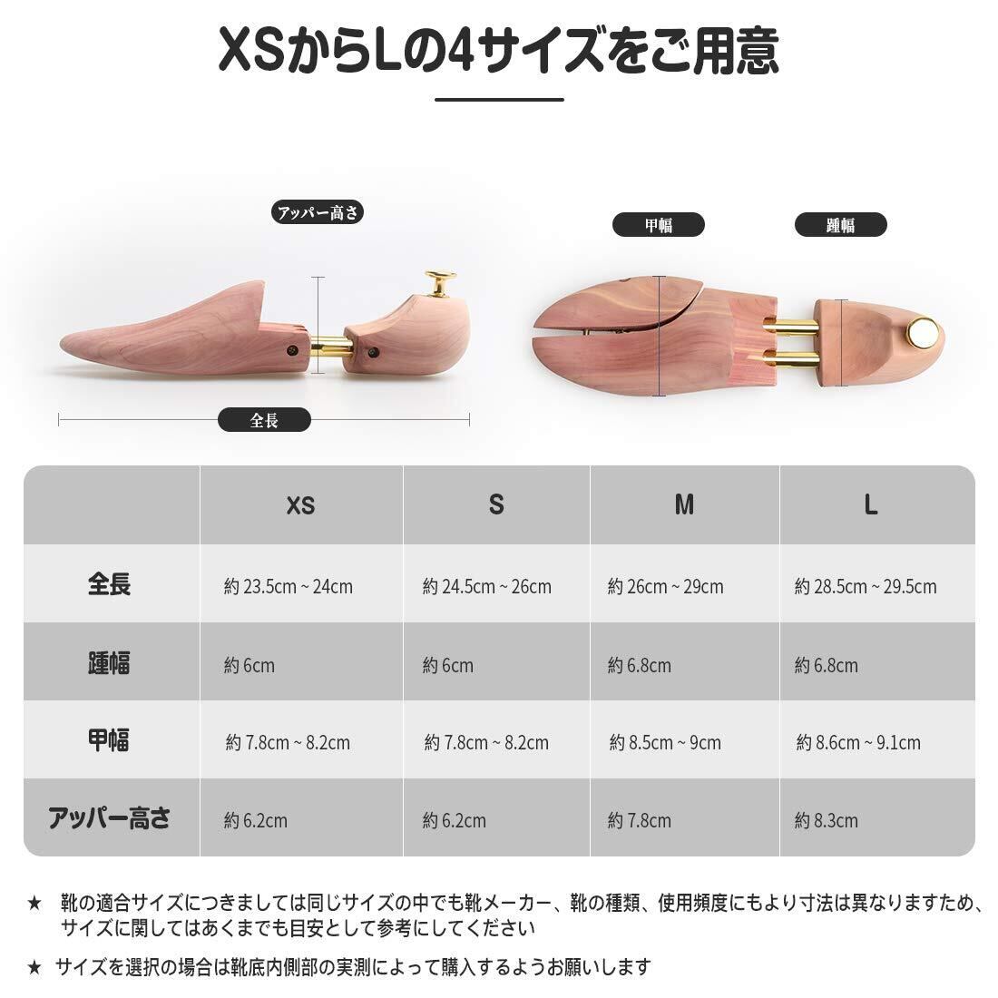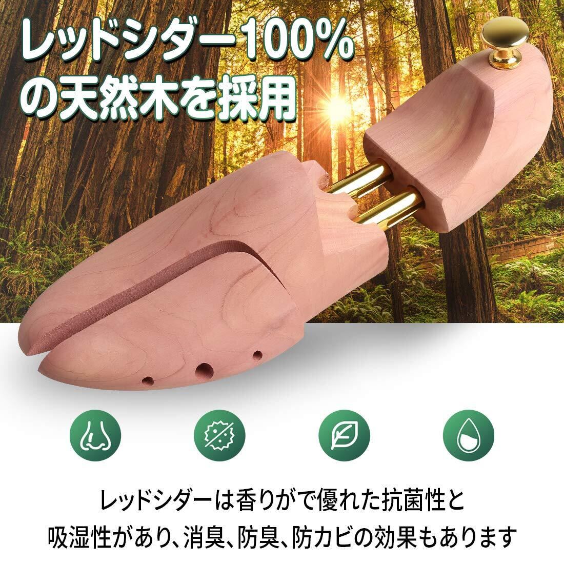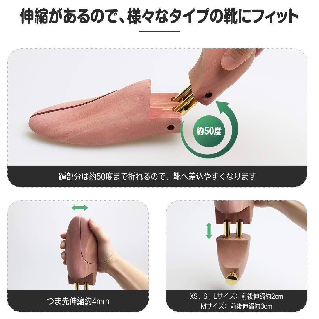 【ツインパイプを採用】XS、S、Lサイズは前後伸縮2cm可動、Mサイズは前後伸縮3cm可動し、ツインパイプを採用しパイプ内にはバネが靴の内側から適度なテンションで靴のしわを伸ばし、靴の型崩れ防止効果が高くなります。レッドシダーの性質上、商品に白い結晶状の物質が付着している場合がございます。その物質は天然物の証とも言えるタンニンオイルと呼ばれる樹液に含まれるもので、靴に害を及ぼすものではありませんのでご安心ください。 サンドペーパーや柔らかい布などで軽く拭いてからご使用ください。その後、日陰の風通された場所に保管してください。