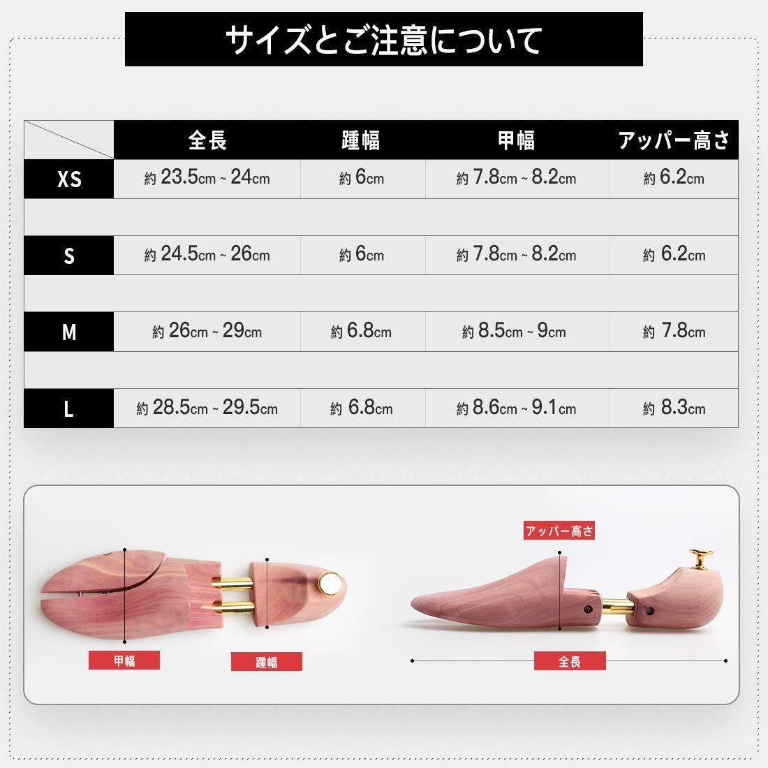 シューキーパーは天然木を使用して手作業で作成される部分もあるため、モノによって木目や色味が違っていたり天然木傷が見られる場合がございます、形にも多少個体差がございます。予めご了承くださいますようお願い致します。サイズを選択の場合は3箇所(全長、アッパー高さ、踵幅、甲幅)の実測によって購入するようお願いします。サイズ表と実測した寸法を合わせて、ご確認の上、ご購入ください。【サイズについて】Sサイズ全長約24.5-26cm、アッパー高さ約6.2cm 、踵幅約6cm 、甲幅約7.8-8.2cm Mサイズ全長約26-29 cm、アッパー高さ約7.8cm 、踵幅約6.8cm 、甲幅約8.5-9.0cm ※26cmMサイズをお勧めいたします。
