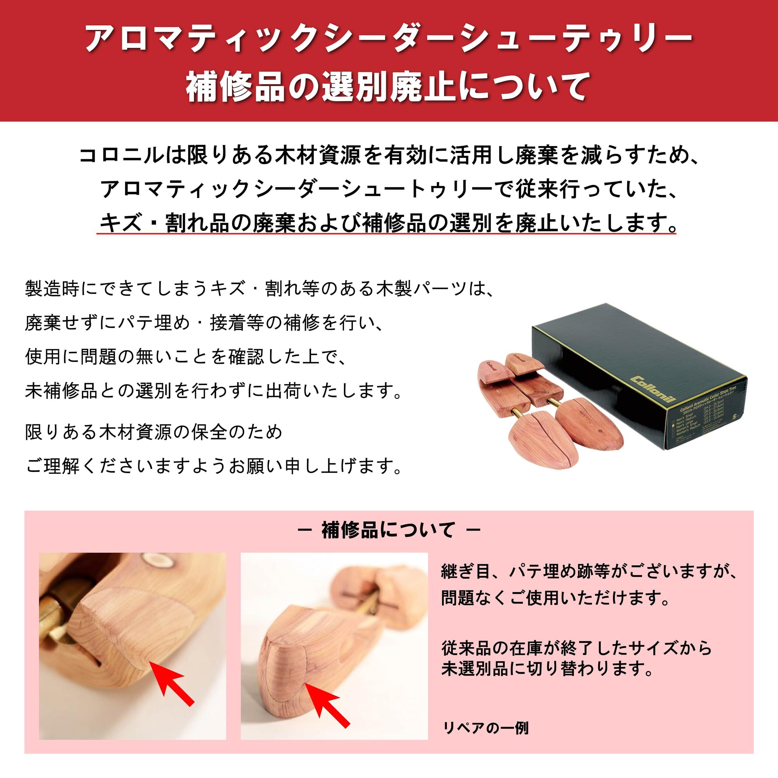シュートゥリーの製造時にできてしまうキズ・割れ等のある木製パーツは、廃棄せずにパテ埋め・接着等の補修を行い、使用に問題の無いことを確認した上で未補修品との選別を行わずに出荷いたします。