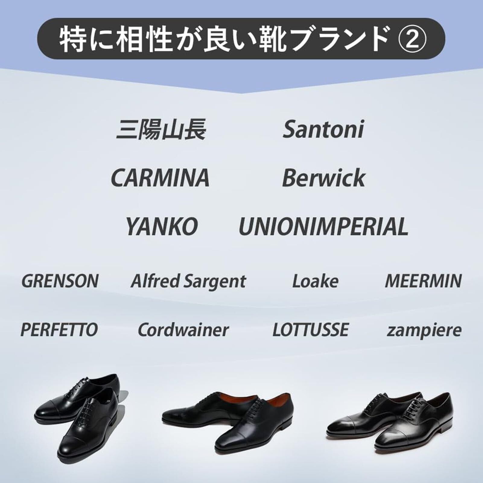 アレンエドモンズ、ジョンストンマーフィー、チャーチ、トリッカーズ、サンダース、リーガル、スコッチグレイン、パラブーツ、ジャランスリワヤなどにピッタリです。