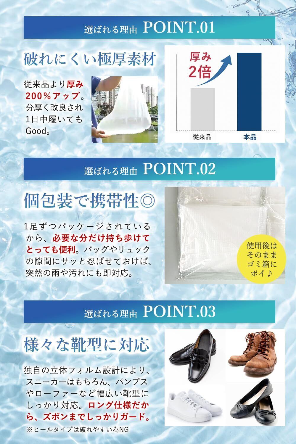 1足ずつ個包装の為コンパクトで携帯に便利です。急な雨にも大事な靴も濡れず,汚れずにすぐに対応できます。使い捨てタイプなので便利です!