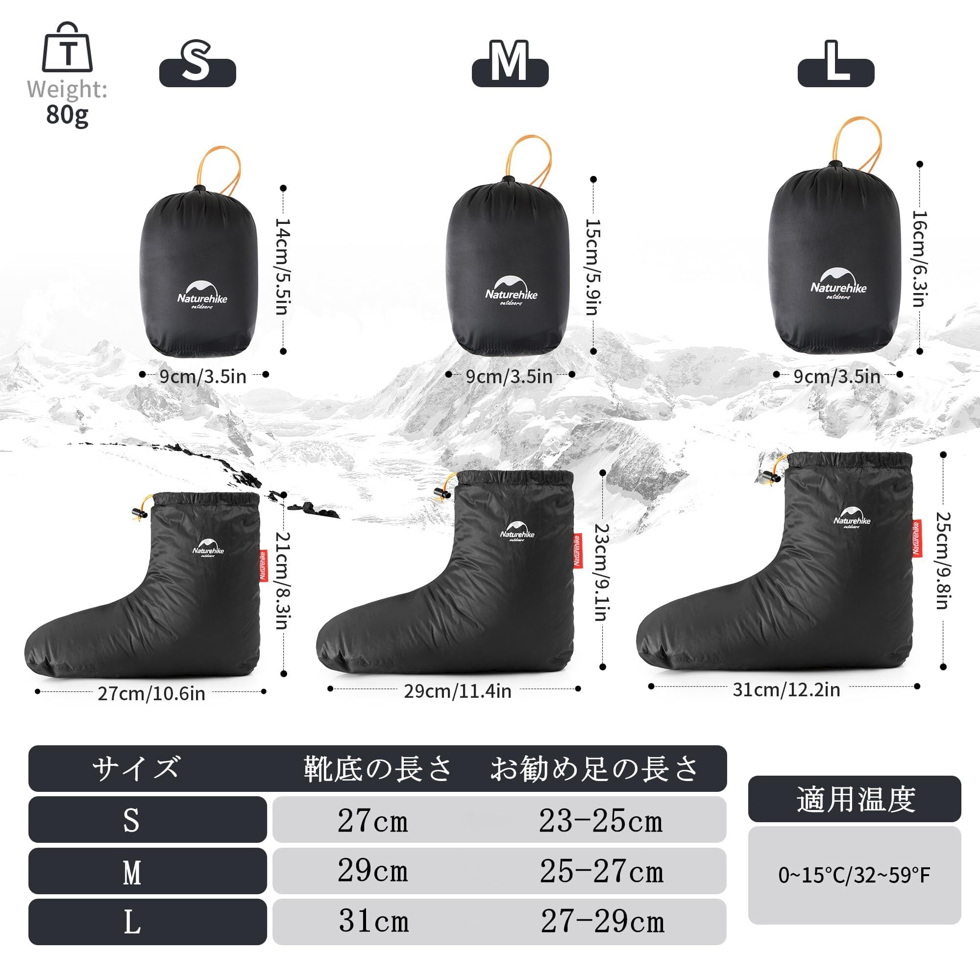 【商品仕様】適用サイズ:23-25(S);25-27(M);27-29(L)、収納サイズ:14×9㎝(S);15×9㎝(M);16×9㎝(L)、重量:約80~90g(収納袋含み)。適用温度:0℃~-15℃。※ 本製品は室内/アウトドアテント内保温用シューズカバーなので、ダウンソックスのようなものです。底部に滑り止め加工がありますが、硬度のある靴底はありません。ご承知おきください。