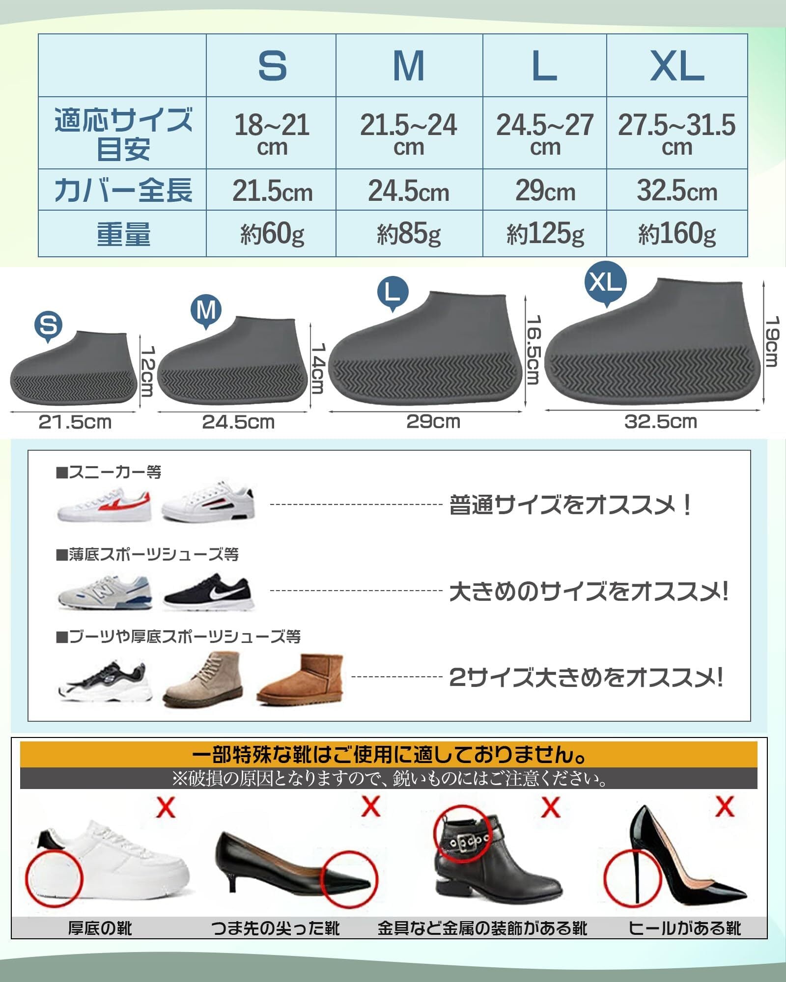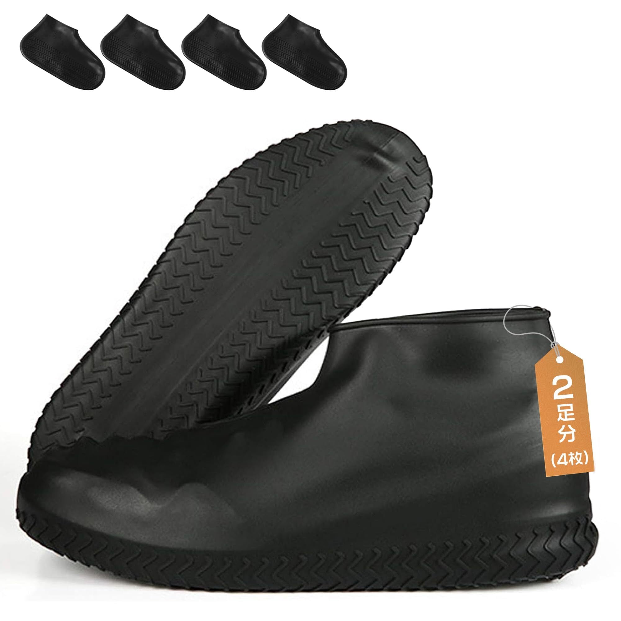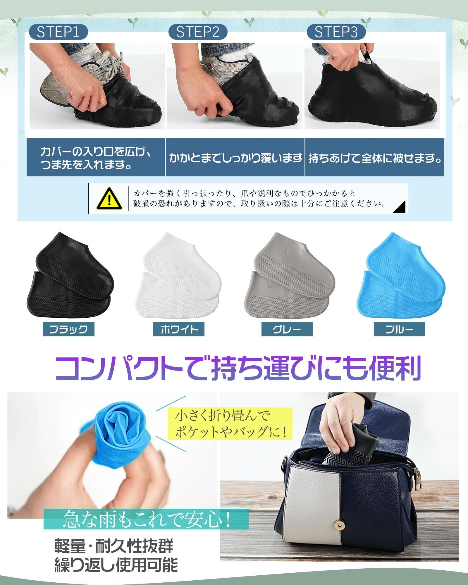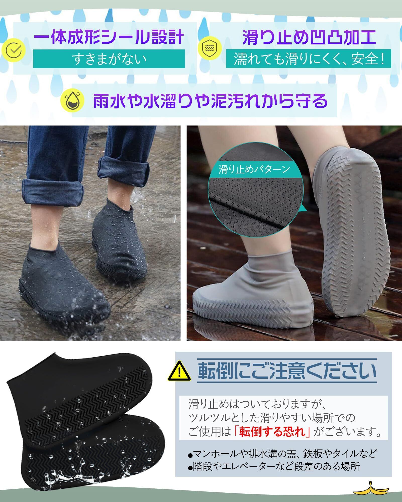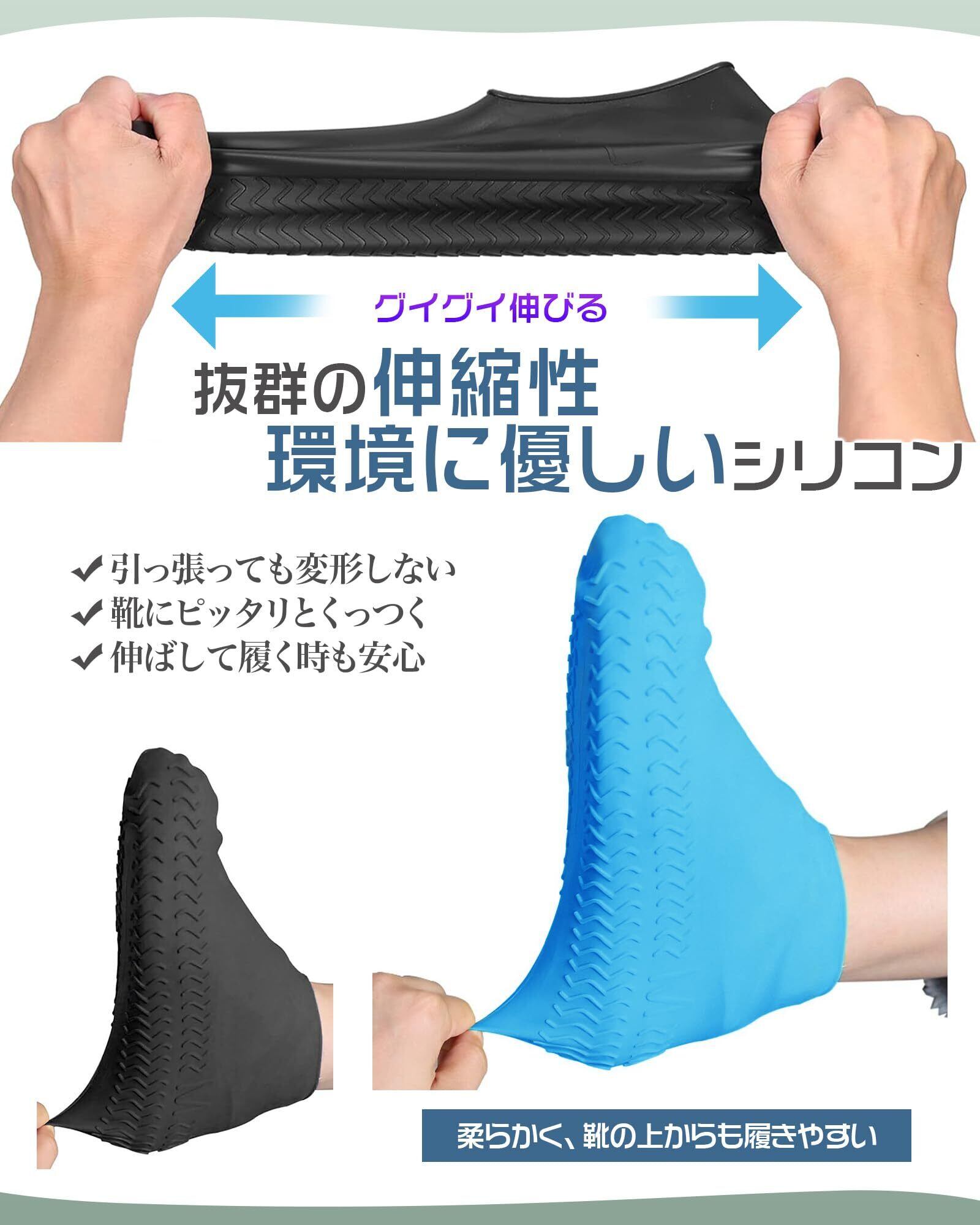【優れた伸縮性・一体成形で隙間なし】セット内容:2足分4枚。伸縮性に優れたシリコン製環境保護素材を使用しており、引っ張っても変形しにくく、着脱も簡単に行えます。一体成形のシール設計で隙間がなく、靴にぴったりとフィットし、雨の侵入を防ぎます。超耐摩耗性で、大切な靴をしっかり守ります。※靴の実際のサイズよりも大きめのサイズをお勧めします。