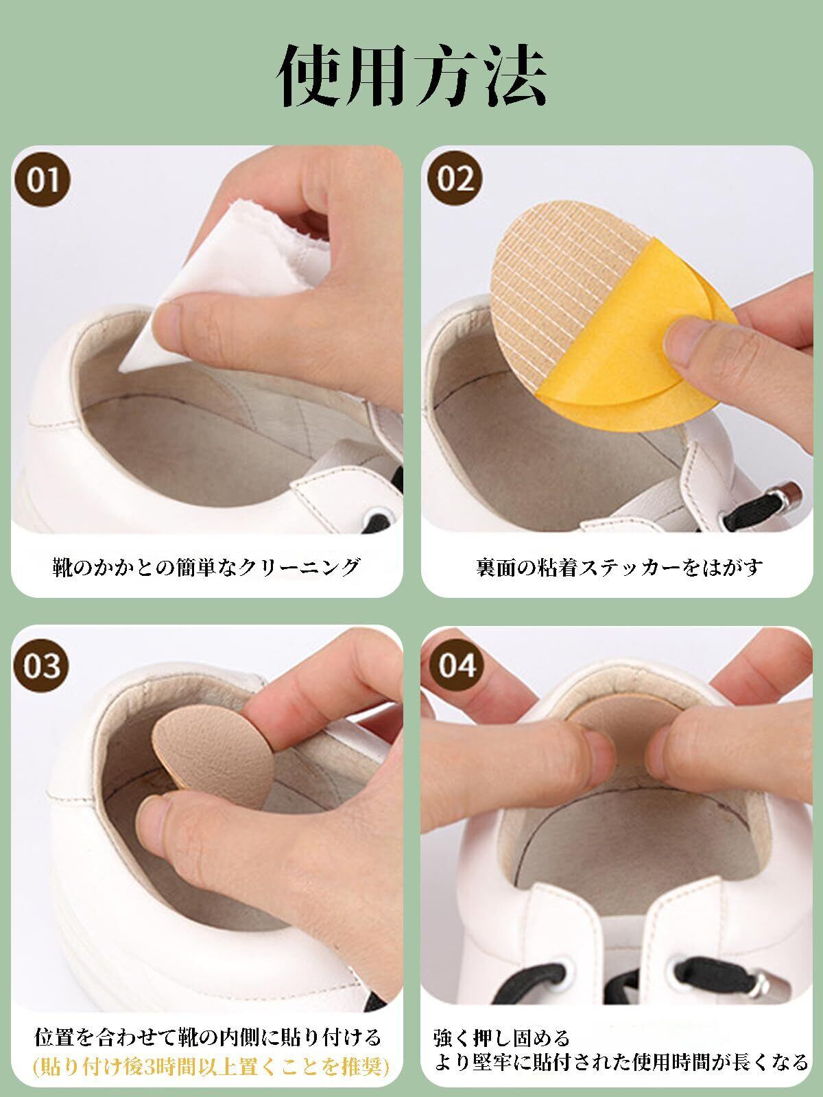 1.[商品内容] 12足セット、ヒールクッション24個、3色:ブラック、ライトグレー、ホワイト。 2.[高品質マテリアル] かかと補修材は超細繊維皮革で作られ、柔らかくて足を磨かず、滑り止め、耐摩耗性、吸汗性、通気性、防水性、皮膚を傷つけず、靴をよく修復し、靴の寿命を延ばす。 3.[柔らかく快適 強力な自己粘着性] 靴修理パッチは防水性と粘着性があり、柔らかく快適なアップグレードされたベルベット生地で作られており、かかと部分に使用すると、簡単に滑り落ちたり、かかとを削ったりしません。補修パッチ裏面のシールを剥がし、傷んだ部分に貼り付けて平らに押すだけで、傷んだ部分を完全に修復できます。 4.[自由にカット可能] この修復パッチは厚さ約1mmと薄型なので、さまざまなサイズや形にカットしたりすることができ、靴に合わせて自由にカット調整できます。パッチを貼る前に、かかとに当ててサイズを確認する。 パッチが大きすぎるようなら、ハサミで適当に切り取ってください。 5.[適用範囲] 靴のかかと補修は、靴革、スニーカー、ハイヒール、ブーツ、バスケットボールシューズなどのすべてのタイプの靴に適しています。日常生活でのご使用とお買い替えニーズにお応えすることができます。数が十分で、必ず家族や友人と共有。