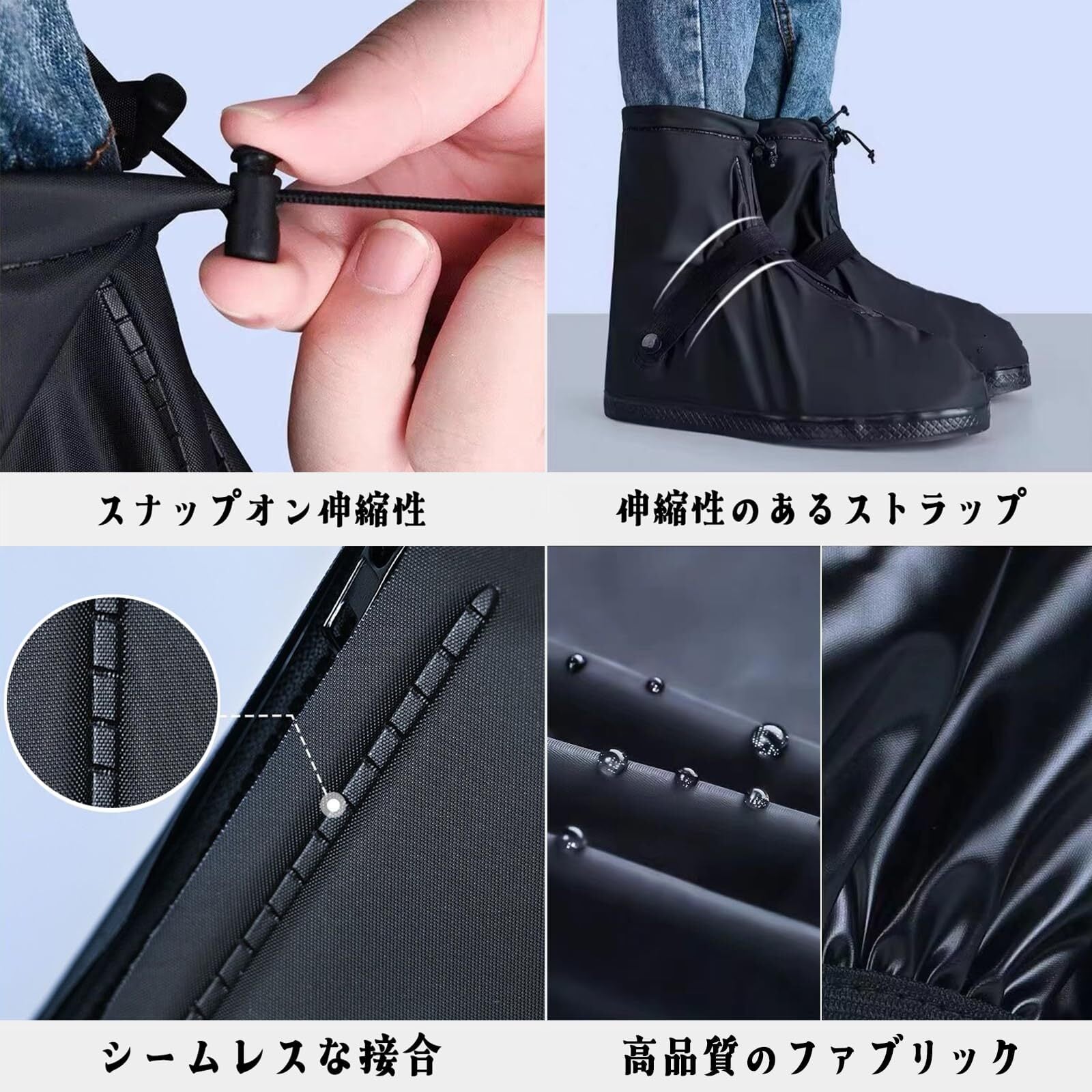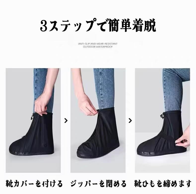 滑り止め靴底:靴底は凹凸の柄を付いた丈夫なゴム製の靴底なので、磨耗&滑り止めの性能アップします!雪の積もった道、濡れた道にも滑りにくくなっています。急な雨や雪でもサッと装着でき、大切な靴を水や泥からしっかり守ります。また靴底側面プレス製法で全体的に靴を包囲して、使い捨ての靴のセットよりもっと耐えられて、長持ちしない欠陥を補いました。