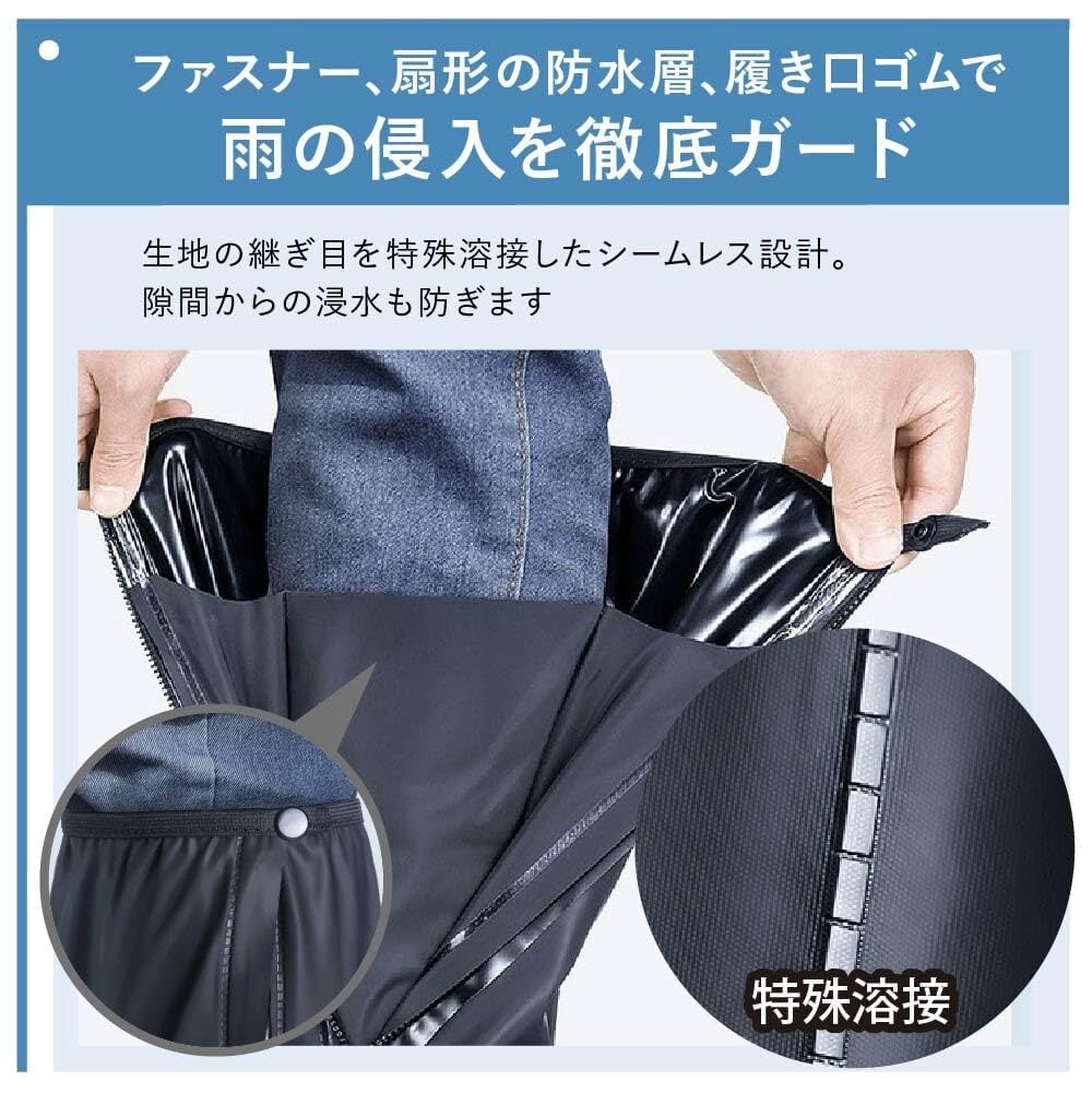 【多重防水構造シームレス設計】ファスナー、扇形の防水層、履き口ゴムで雨の侵入を徹底ガード。生地の継ぎ目を特殊溶接したシームレス設計。隙間からの浸水も防ぎます