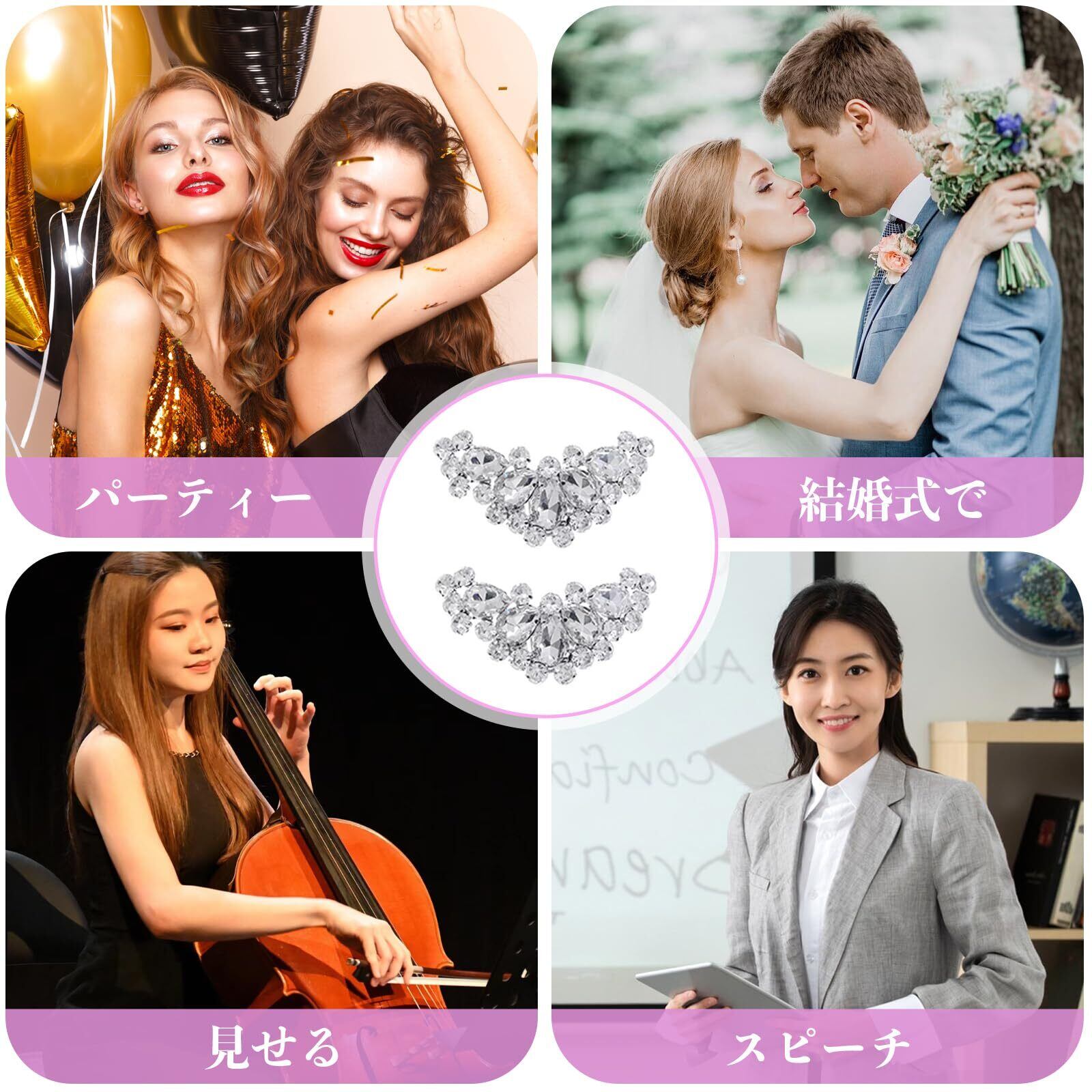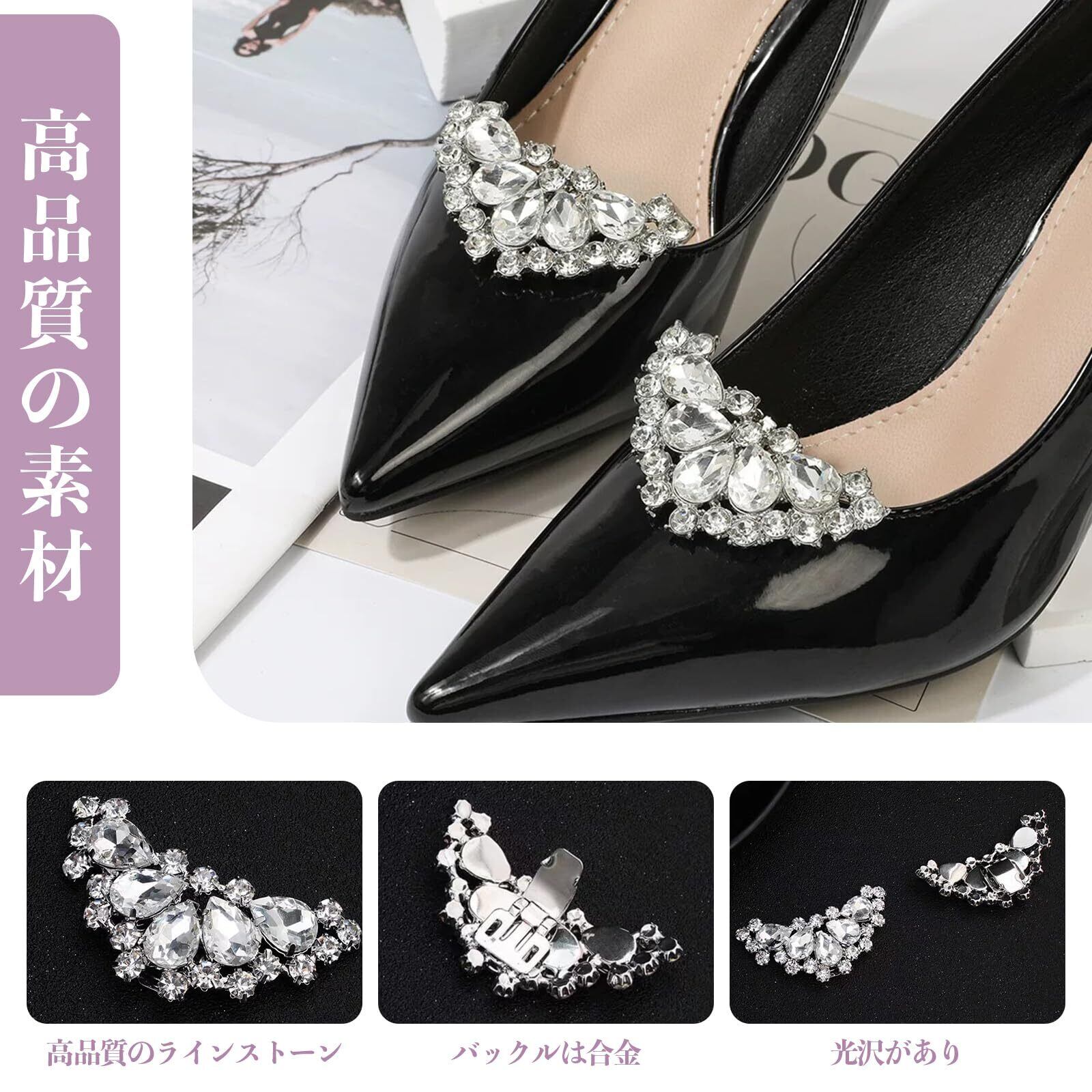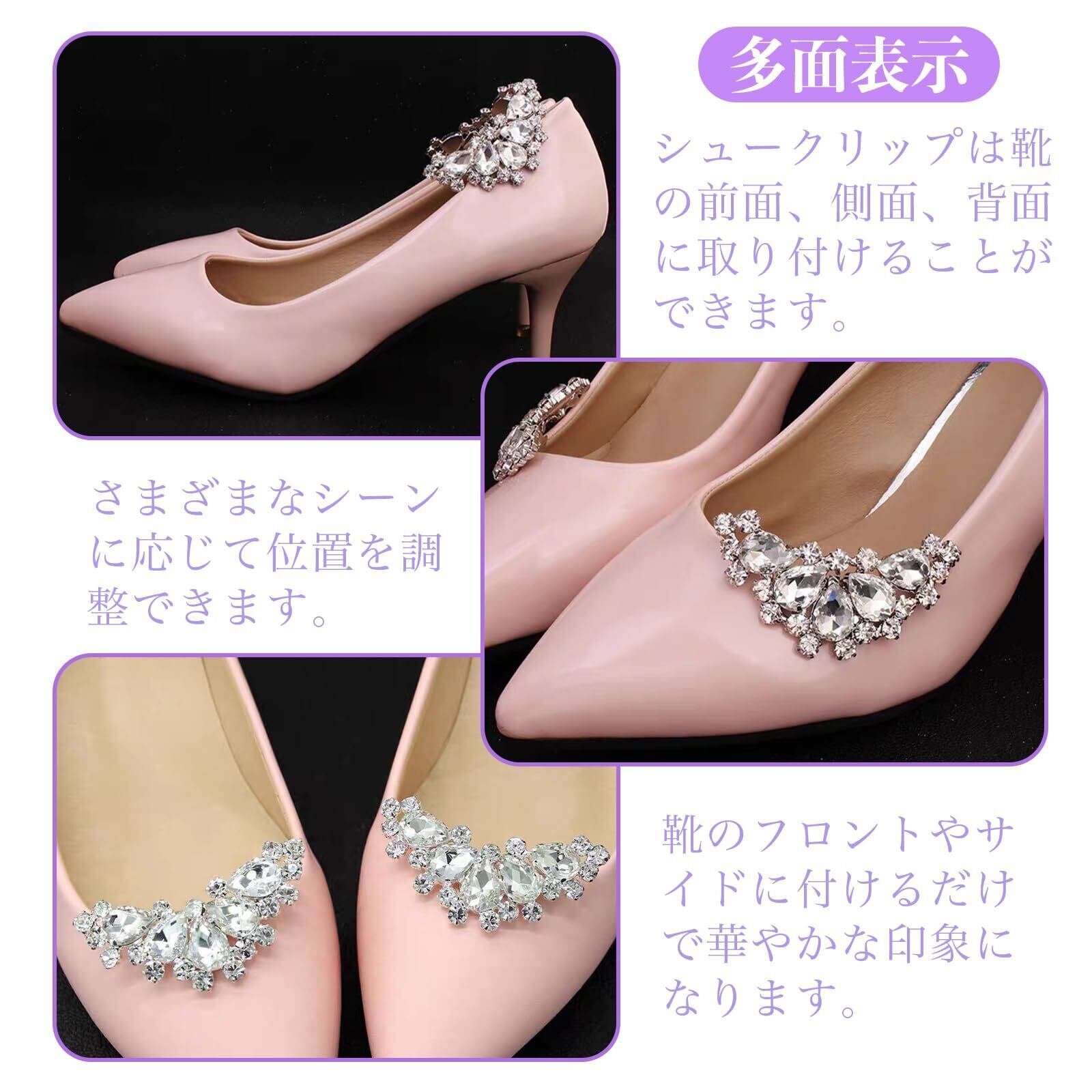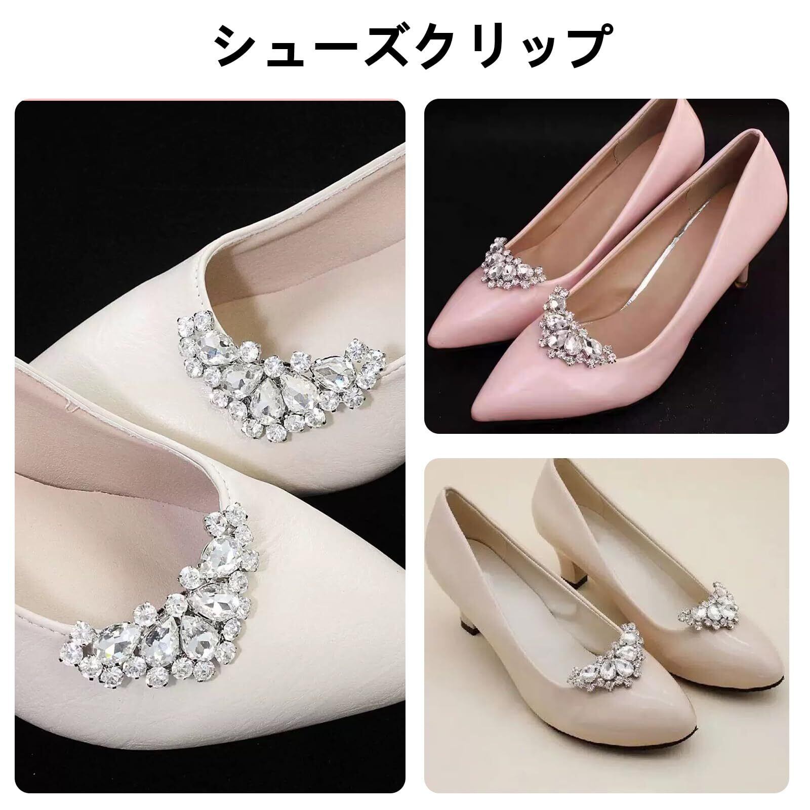 【幅広い用途】シューズクリップは、ウェディングシューズ、ハイヒール、フラットシューズ、ブーツ、サンダルだけでなく、スカーフ、帽子、ドレス、財布やハンドバッグの装飾に使用することができます。結婚式やパーティーなどのフォーマルシーンや特別な日のお出かけにピッタリのアイテム。