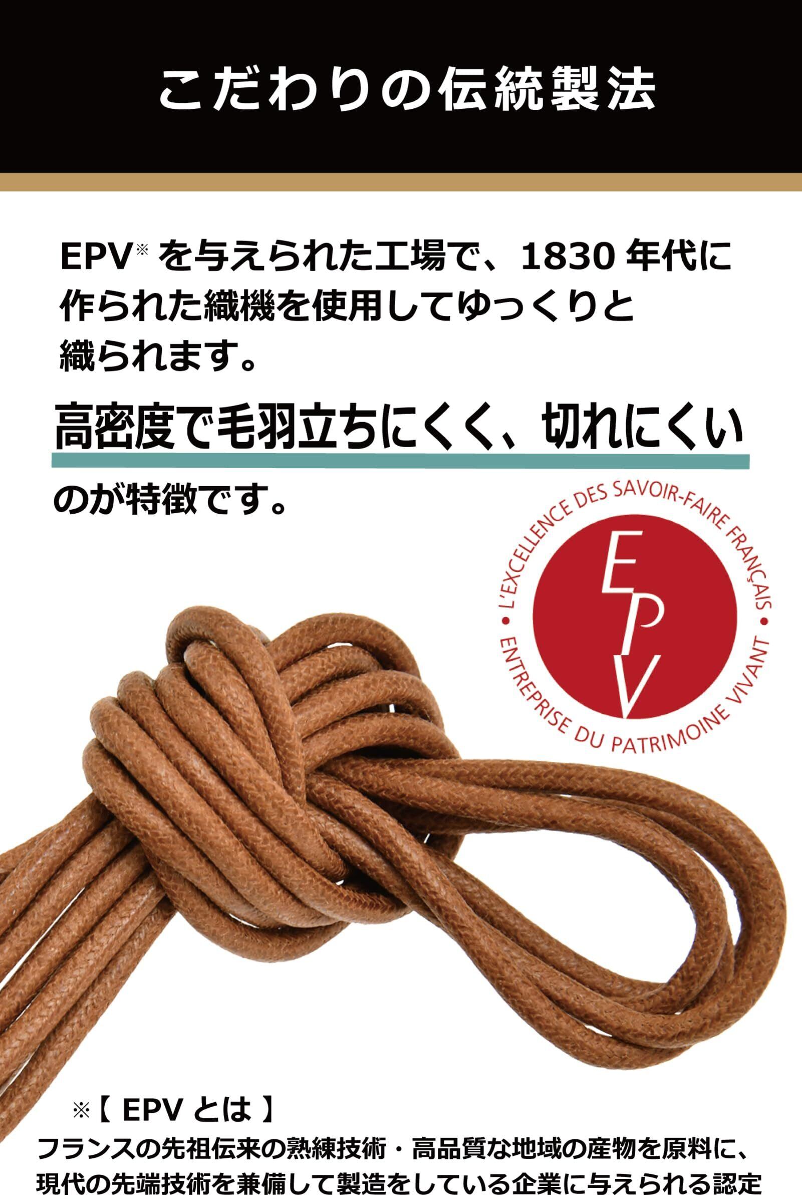 EPV(卓越した伝統的技術継承のため、フランス政府により無形文化財として指定された企業)の称号を持つ靴ひも工場にて、1830年代の織機でゆっくり丁寧に織られたコットンを贅沢に使用しています。