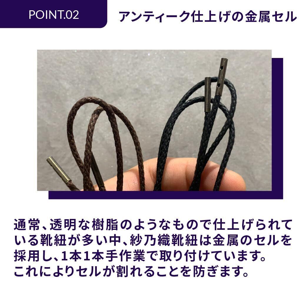 紗乃織靴紐(さのはたくつひも)は、職人が紐一本一本を手作業で作り上げる至極の靴紐です。丁寧に蝋付け加工を施すことで靴紐の結び目がしっかりとしなやかに結束することが最大の特長です。靴紐の先端のセルは、アンティーク仕上げの金属を手作業で丁寧に取り付けています。強靭な作り、しなやかな使い心地。表面をロウで加工しているので、丈夫で耐久に優れています。最後に紐を結わく時に感じる、紐がギュッと締まる感覚。ほどけにくく、伸縮性も優れている日本の職人によるハンドメイドの最高級蝋引き靴紐を是非お楽しみ下さい。