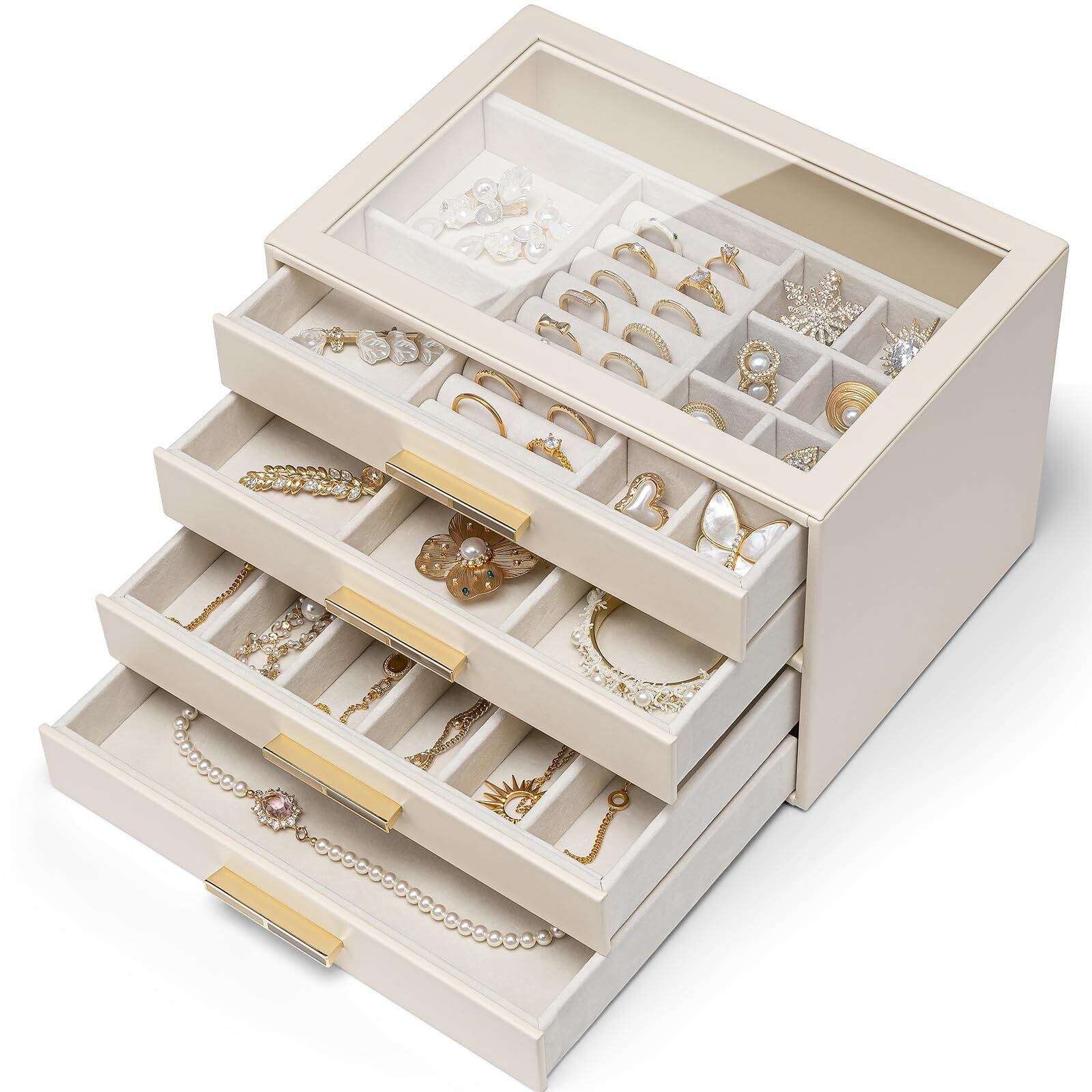 Vlando ガラス蓋 4段引き出し ジュエリーボックス 女性用ジュエリーボックス ネックレス 指輪 イヤリング ブレスレット アクセサリー収納用 オーガナイザー
