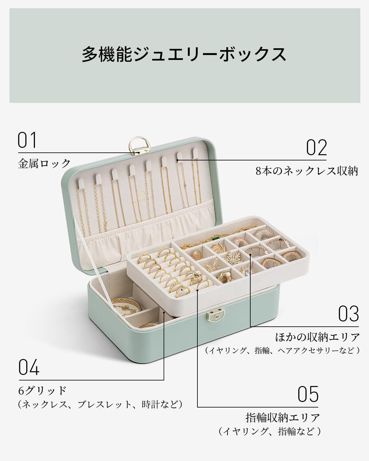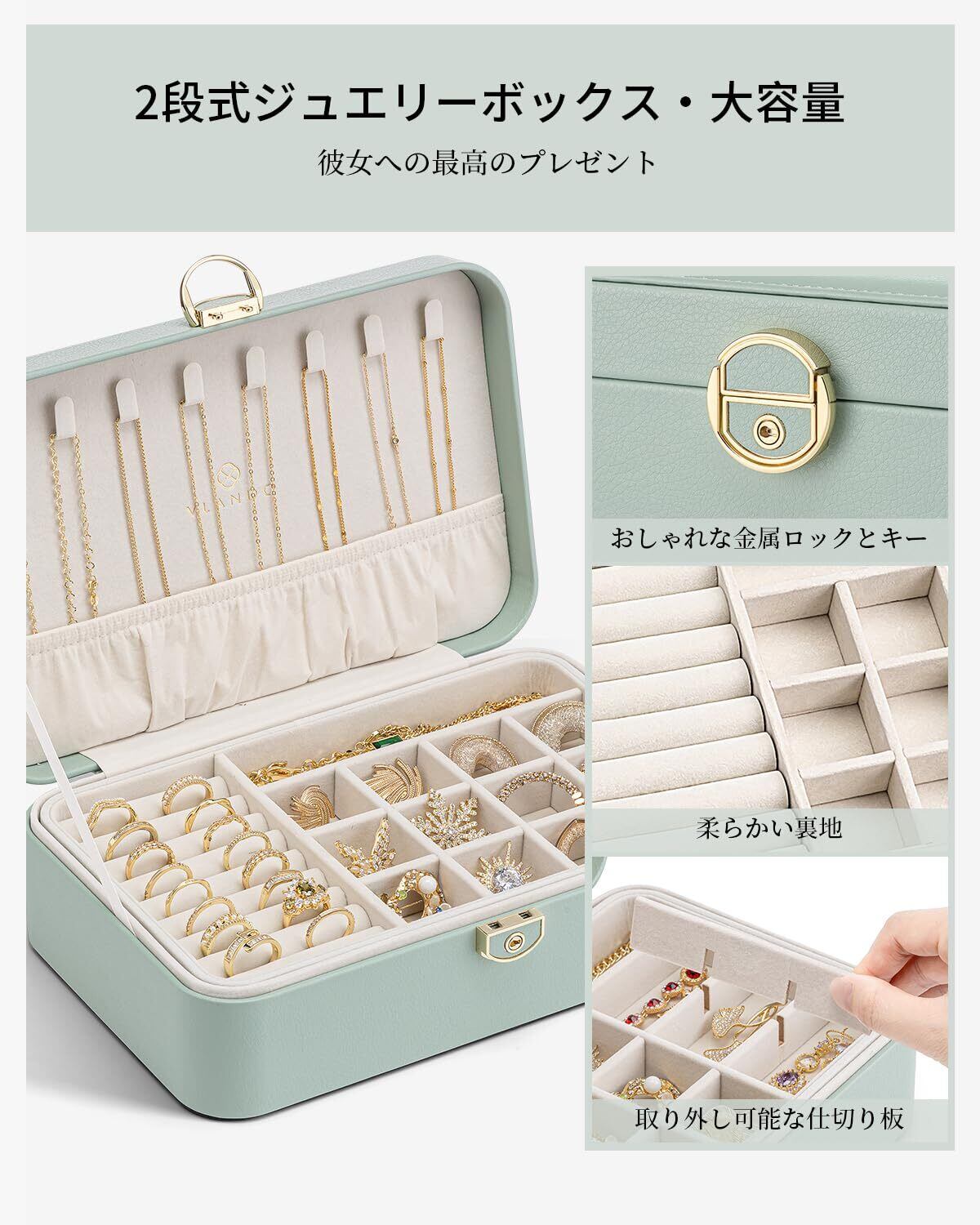 【使いやすさと実用性】大容量で機能的な収納、高級感のある外観、安全性の高い鍵付き設計など、Vlando二段式ジュエリーボックスは実用性と使いやすさを兼ね備えた優れた製品です。ジュエリーコレクションの整理に最適なアイテムです。
