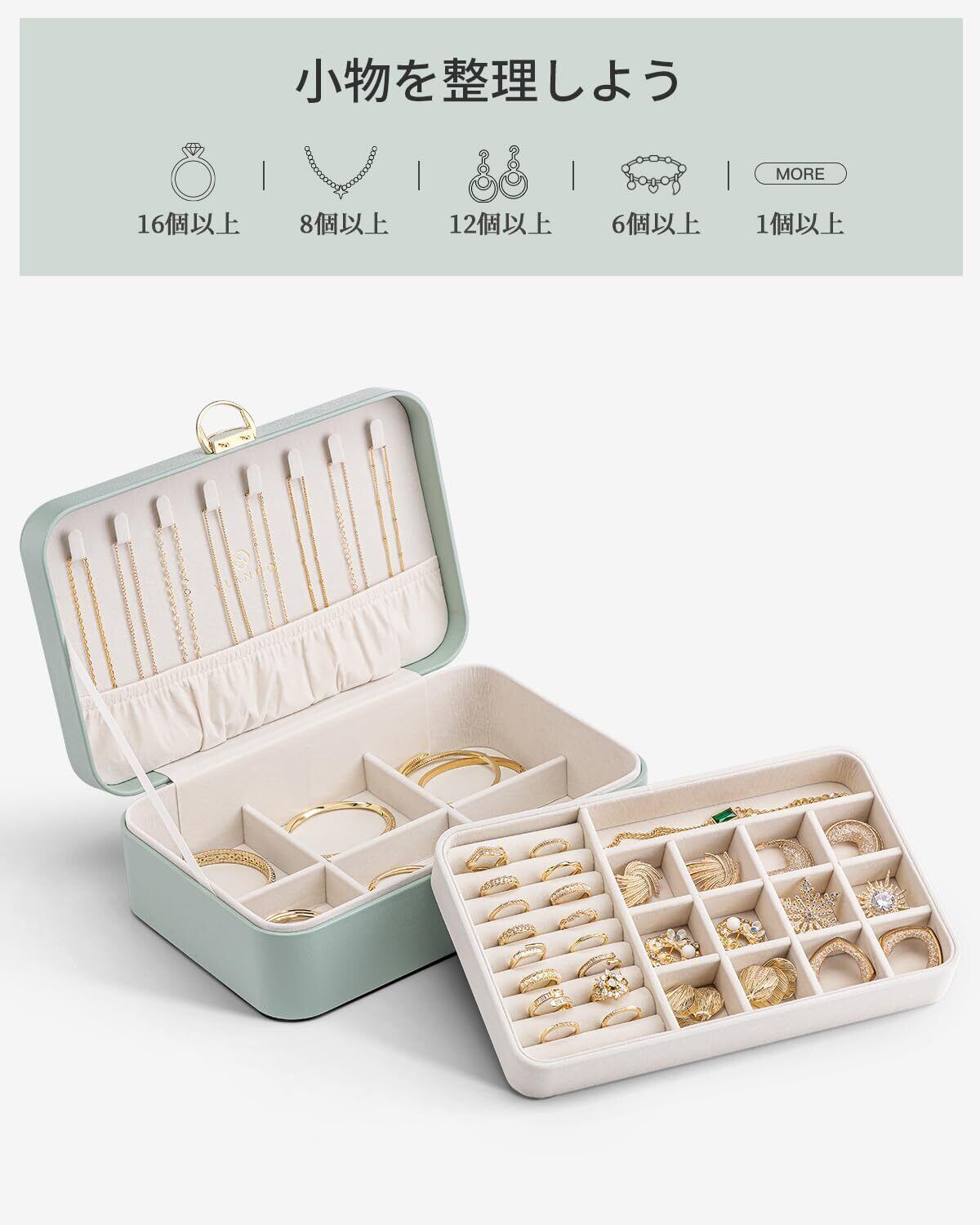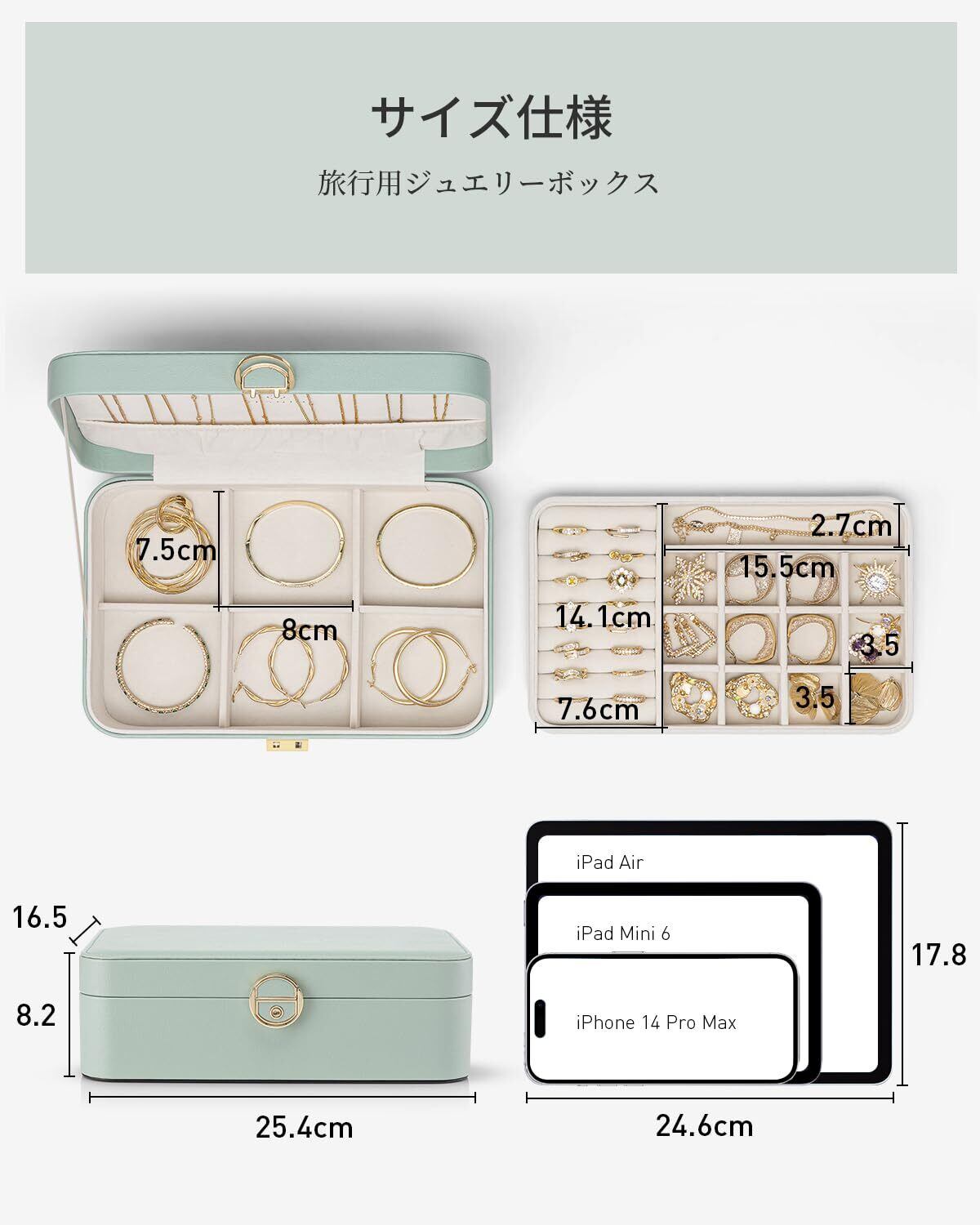 【大容量収納】寸法16.5*8.2*25.4cmの大容量設計で、Vlando二段式ジュエリーボックスはネックレスは8本以上、リングは16個以上の収納が可能です。時計やブレスレット、ピアスなどの小物も自由に収めることができます。豊富な収納スペースにより、あなたのジュエリーコレクションを一箇所にまとめて整理できます。鍵付きの構造で大切な品々を守り、柔らかな人工皮革製の上品な外観はインテリアにもなじみます。洗練されたデザインと高品質な仕上がりで、ジュエリーコレクションの中心となる収納ボックスです。