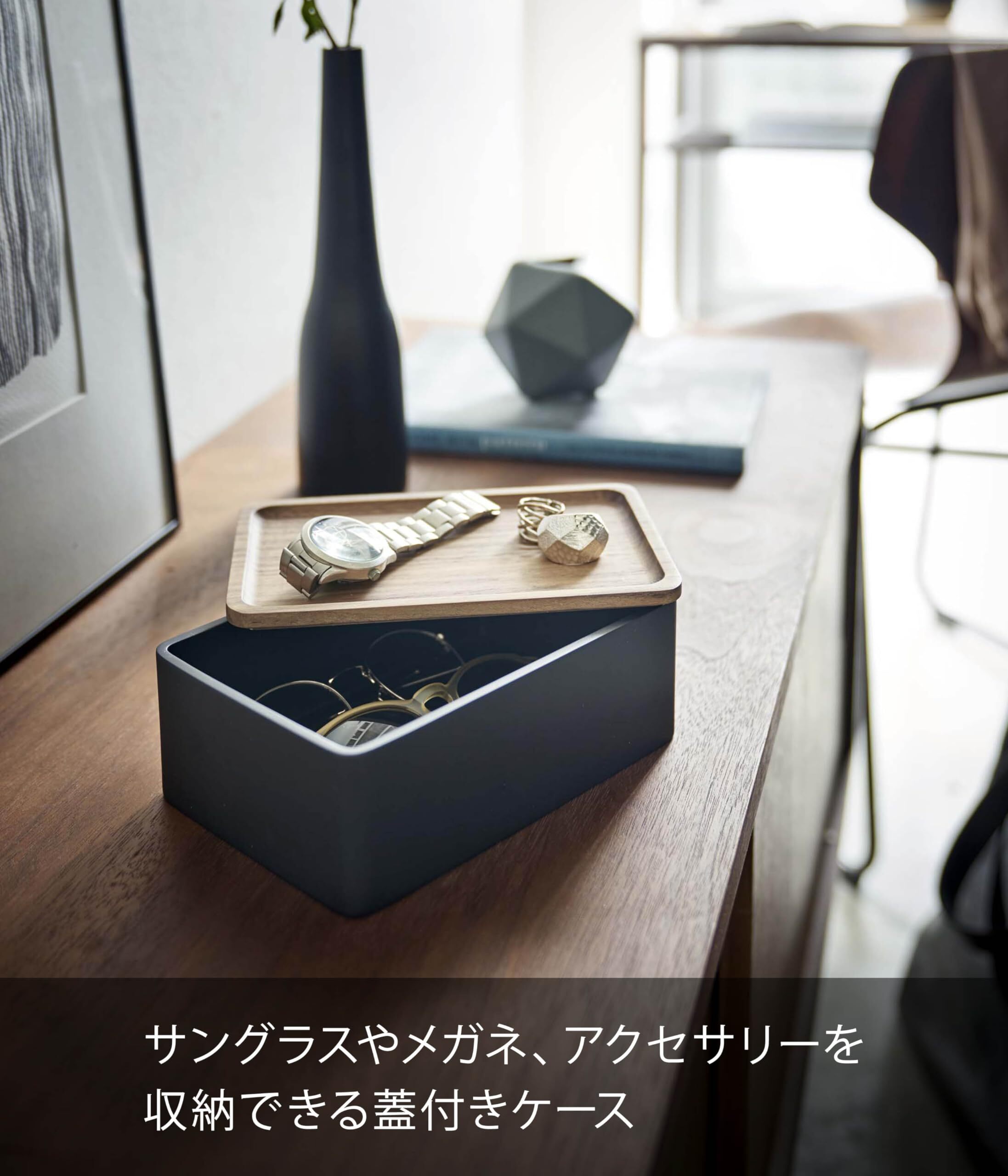 サングラスやメガネ、アクセサリーを収納できる蓋付きケース。
