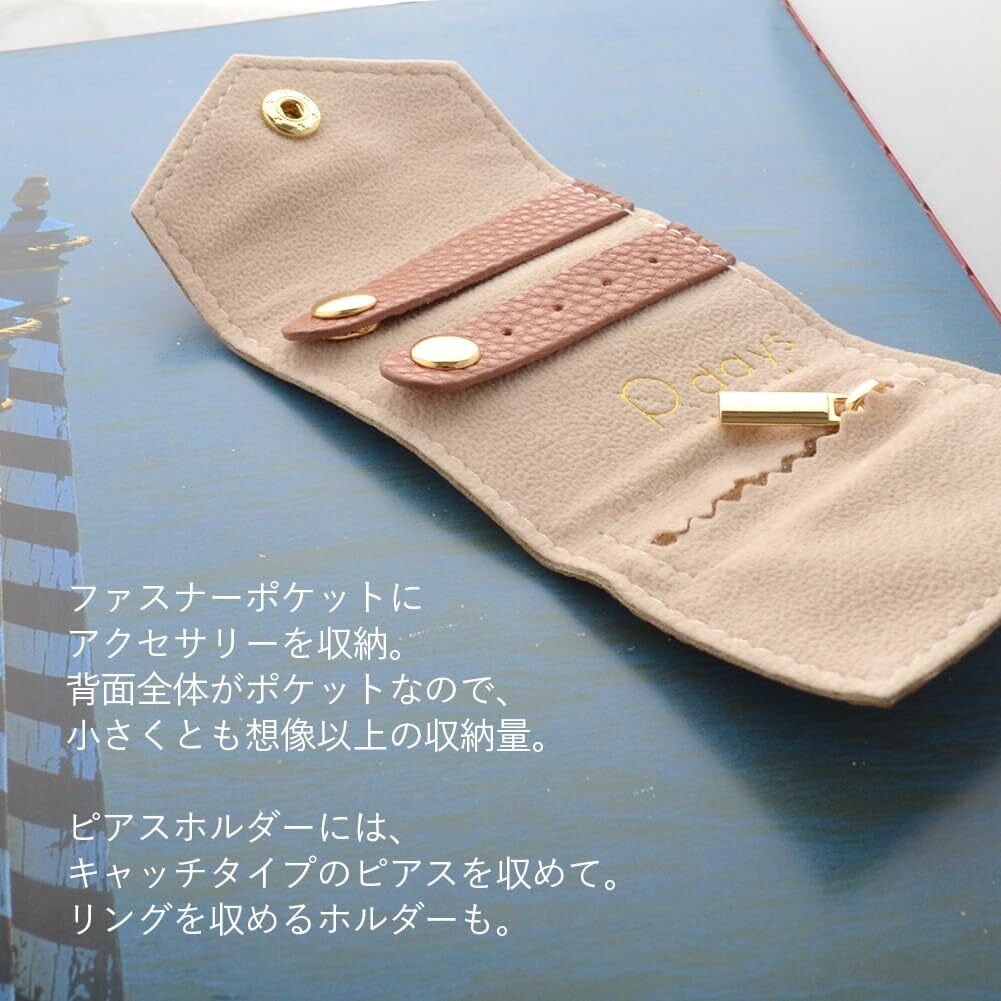 【想像以上の収納量】ファスナーポケットにアクセサリーを収納。背面全体がポケットなので、小さくとも想像以上の収納量。ピアスホルダーには、キャッチタイプのピアスを収めて。リングを収めるホルダーも。ネックレスのチェーンをホルダーにひっかけ、モチーフをファスナーポケットに入れれば、チェーンがからまりません。