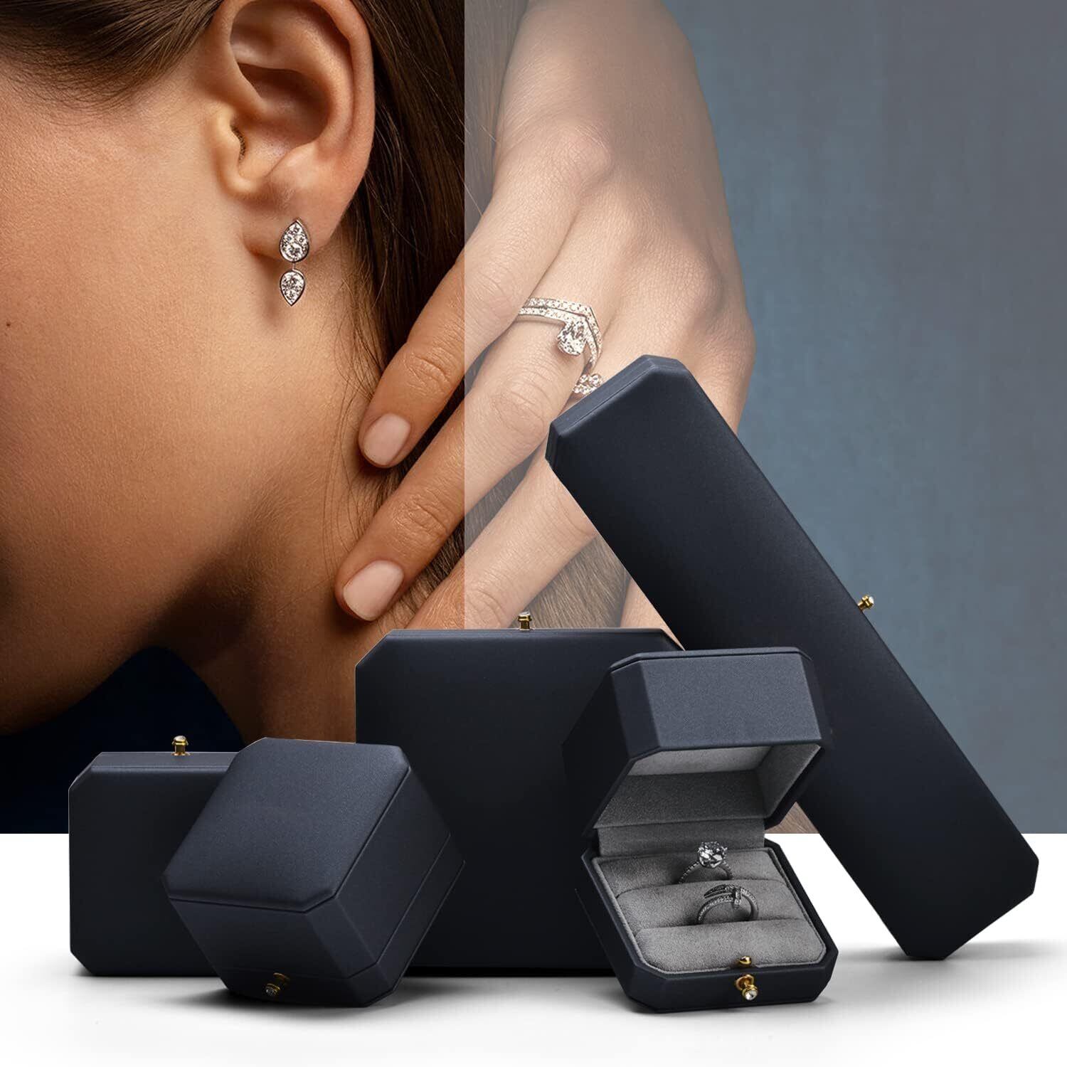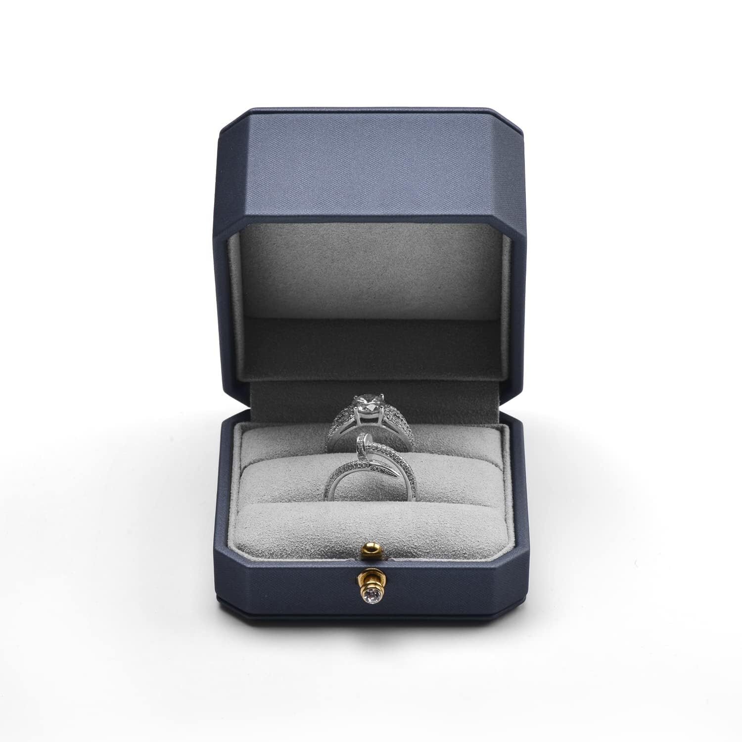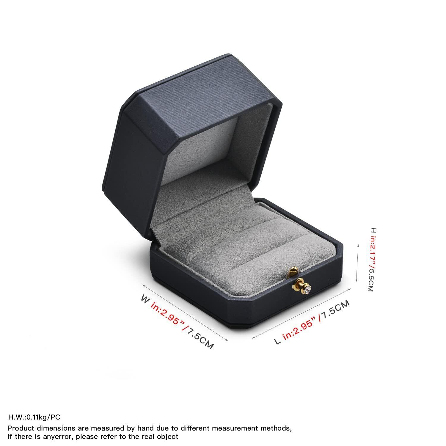 【こだわりのデザイン】この指輪ケースは伝統的な四角や丸型とは異なり、クラシックでユニークな八角形のデザインが、一目で目立ち、ブランド認知度を高めるだけでなく、リングボックスをより重層的で高級感のあるものにしています。ケースの開閉は簡単で、前方の金具を押すだけでパカッと開きます。リングケースの上部(蓋部分)を深くすることで、大きなジュエリーも収納できます。