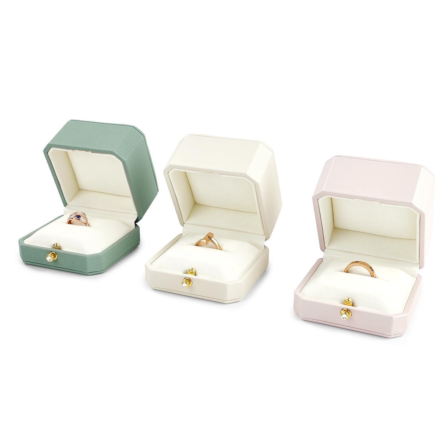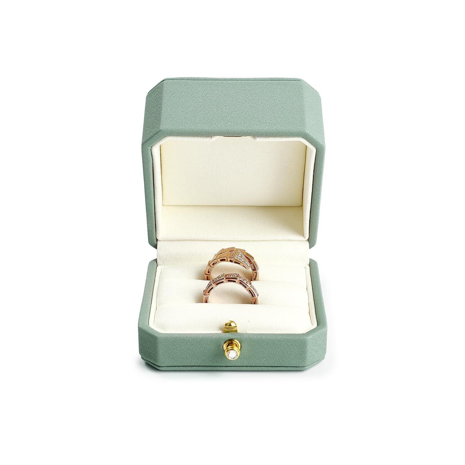 【こだわりのデザイン】この指輪ケースは伝統的な四角や丸型とは異なり、クラシックでユニークな八角形のデザインが、一目で目立ち、ブランド認知度を高めるだけでなく、リングボックスをより重層的で高級感のあるものにしています。ケースの開閉は簡単で、前方の金具を押すだけでパカッと開きます。ケースの上部(蓋部分)を深くすることで、大きなジュエリーも収納できます。