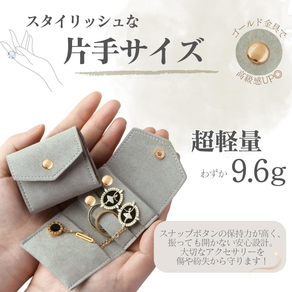 【小さく軽量で携帯に便利】 重さ約9.6g、折りたたむと縦52×横60mmと手のひらサイズで、バッグやポケットにすっきり収まるジュエリーポーチです。