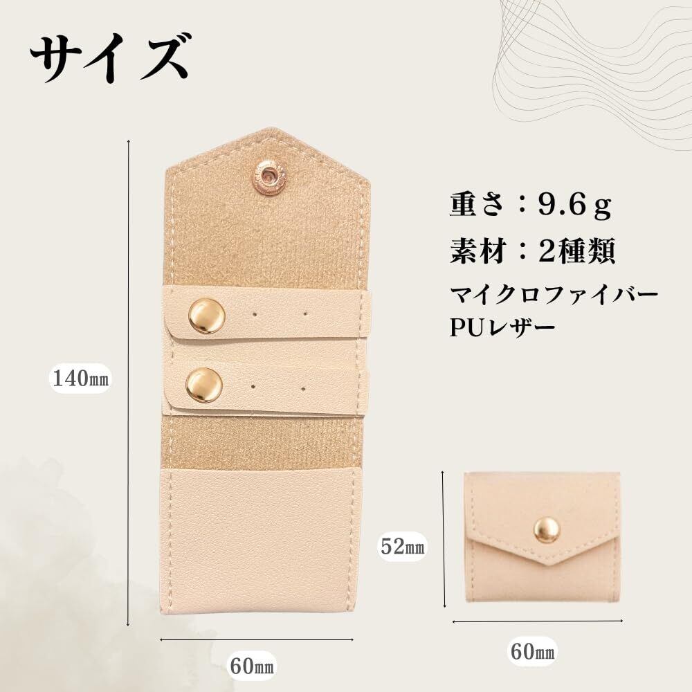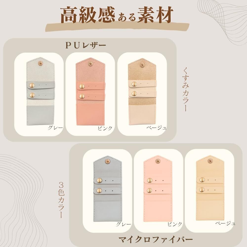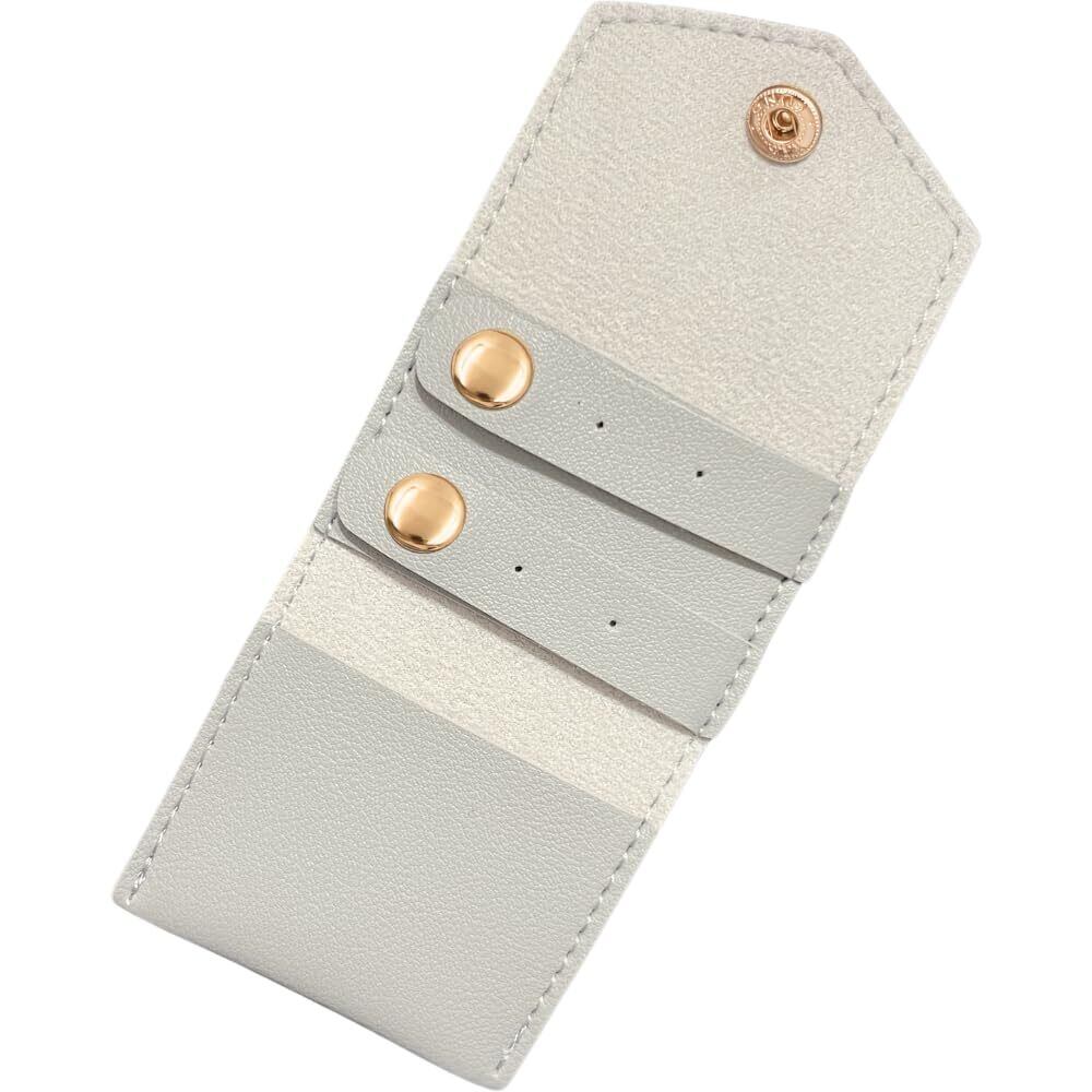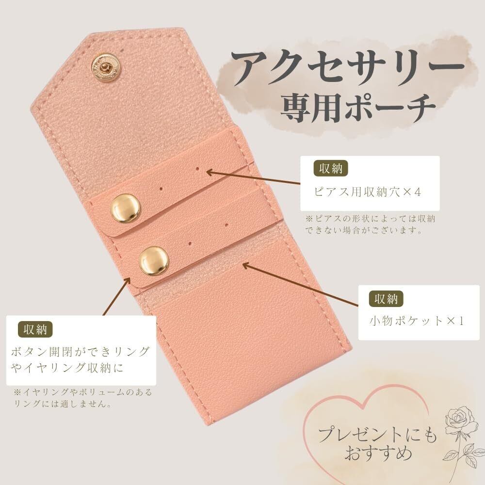 【ピアス・指輪に特化した収納設計】 ボタン開閉できるピアス用収納穴×4と小物ポケット×1付きで、リングやイヤリングをしっかり整理でき、出先でも安心です。
