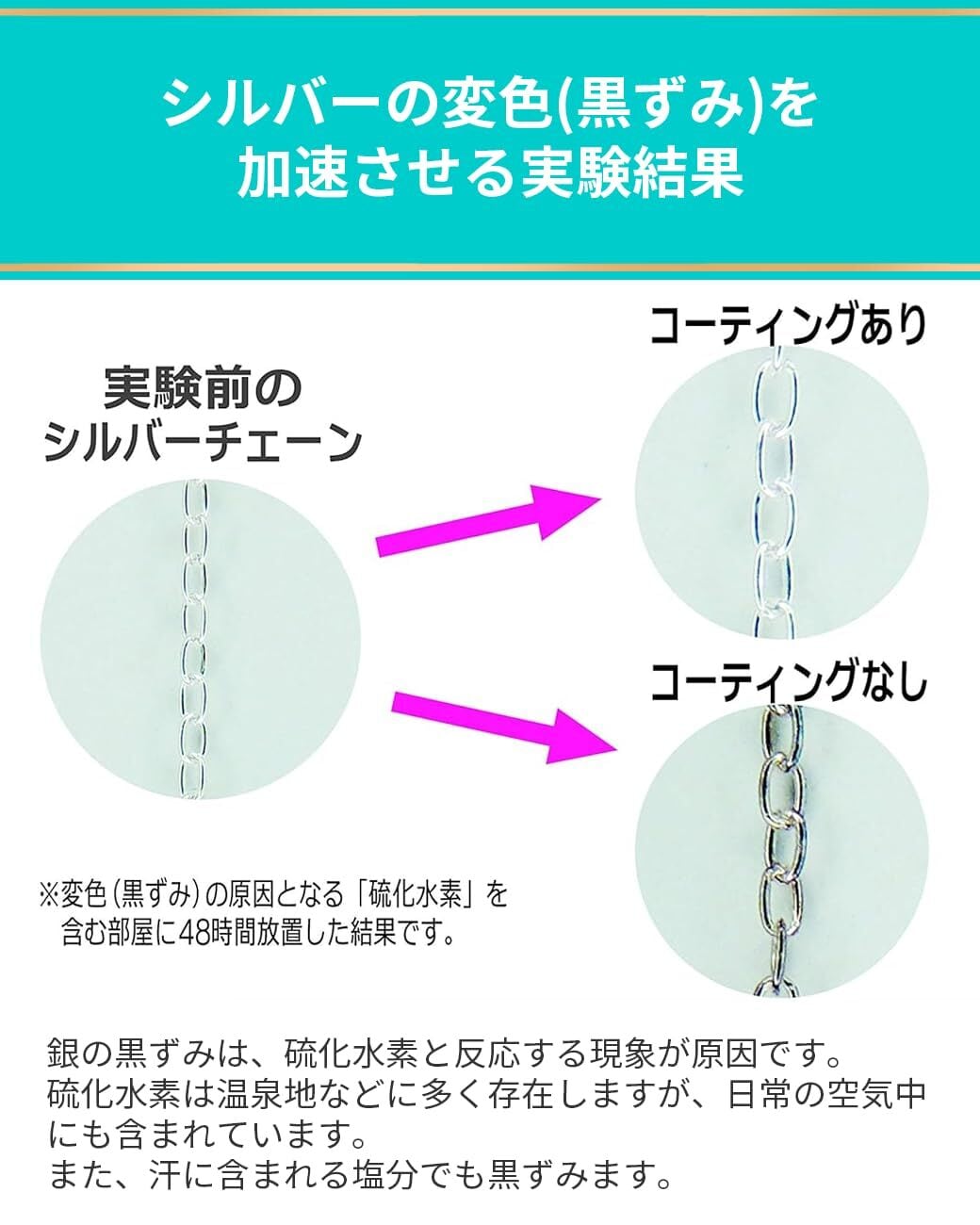 【皮膚への有害性無し】 アクセサリーに使用できるコーティング剤として、皮膚への刺激性や危険な有害性はありません。(JIS基準)