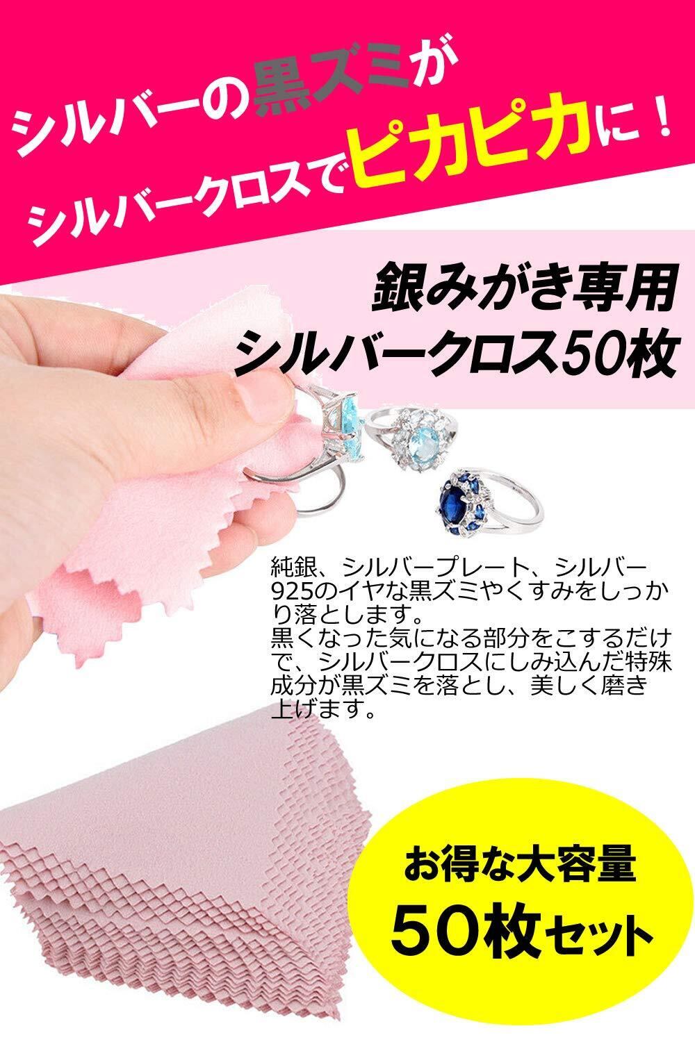 銀磨きセット:3つのバリエーション。シルバー磨き布を大容量50枚セット、シルバー磨き布25枚と磨き棒5本のセット、シルバー磨き布30枚と磨き粉のセット。