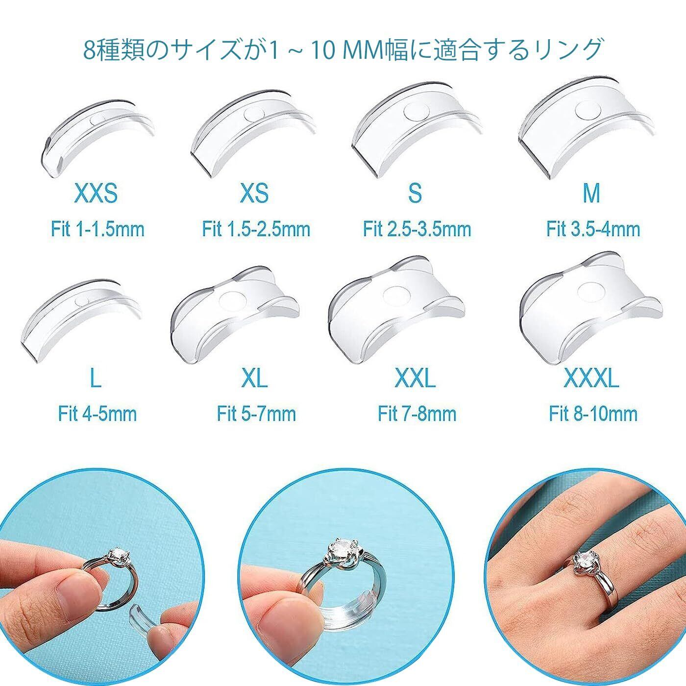 【セット内容】セットには8種類のサイズのリングアジャスターが含まれています:1.5mm XXS、2.5mm XS、3.5mm S、4mm M、5mm L、7mm XL、8mm XXL、10mm XXXLで、幅1mmから10mmまでの様々なリングに対応します。