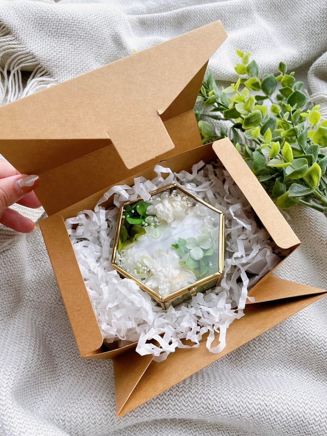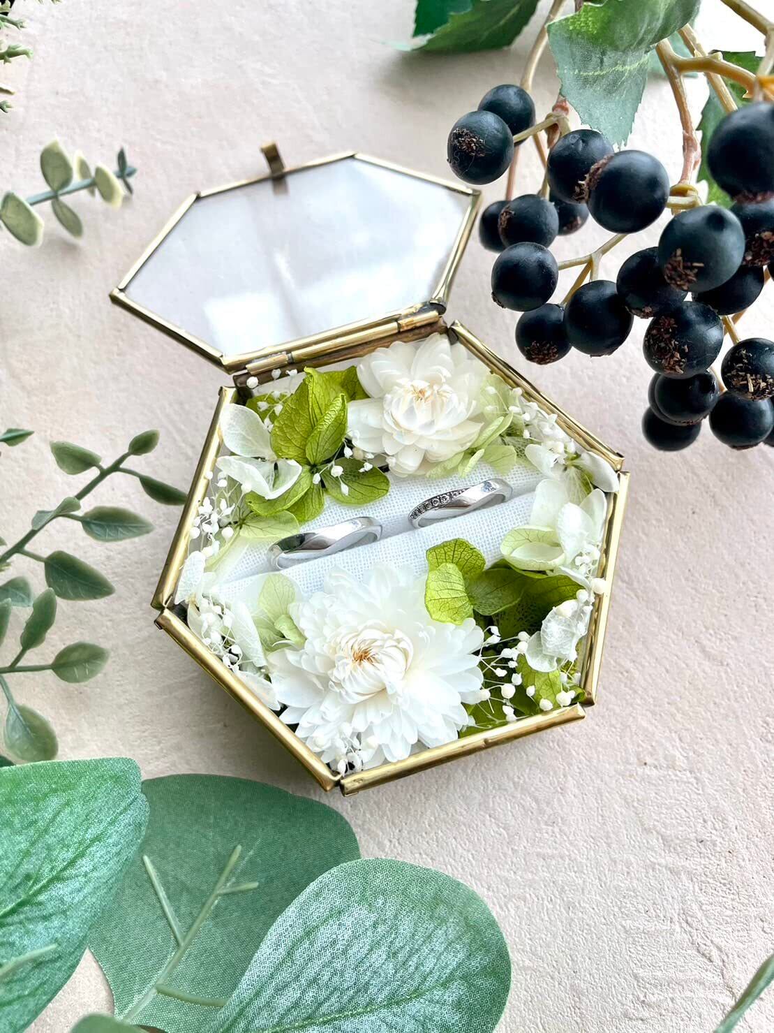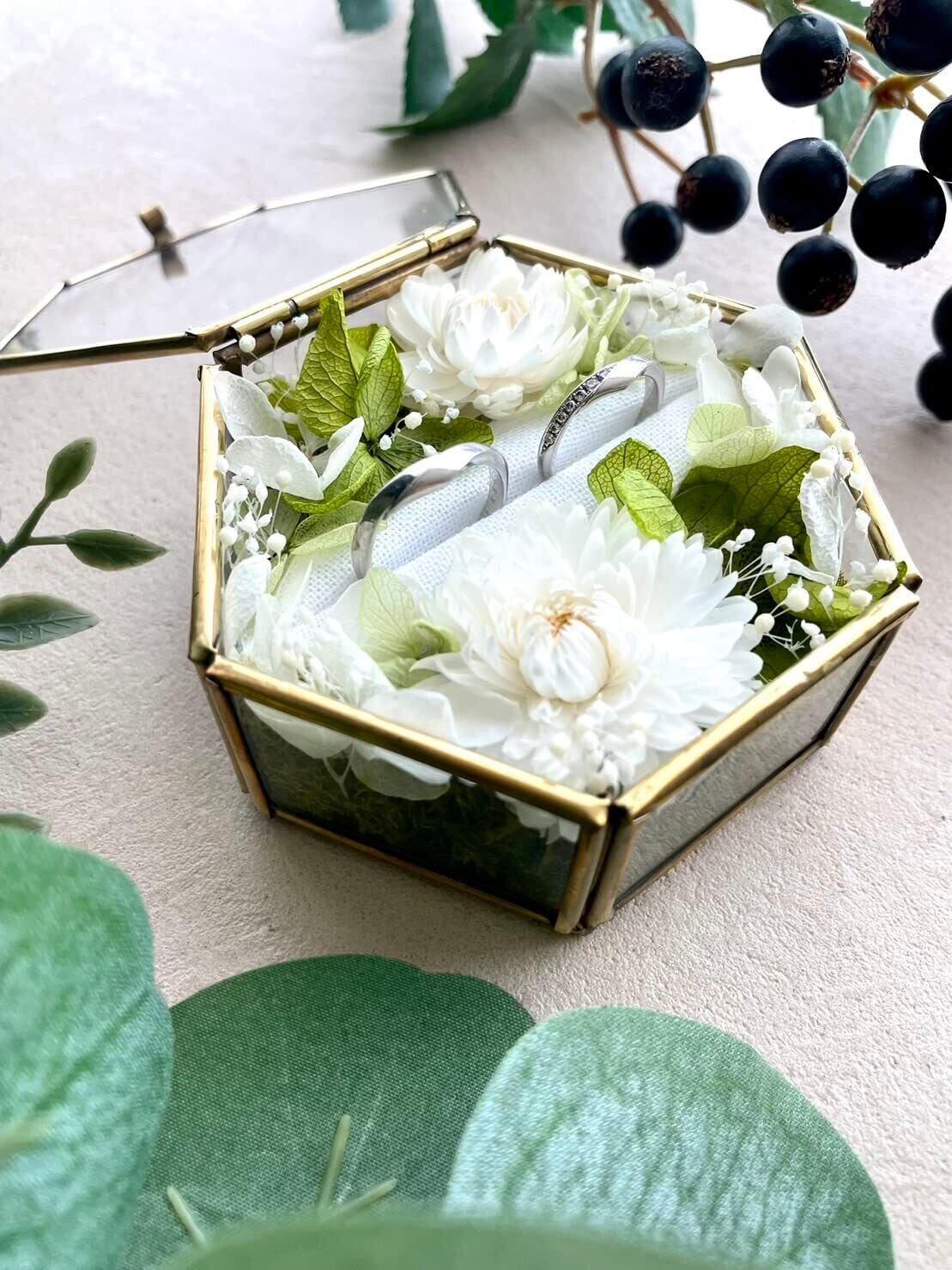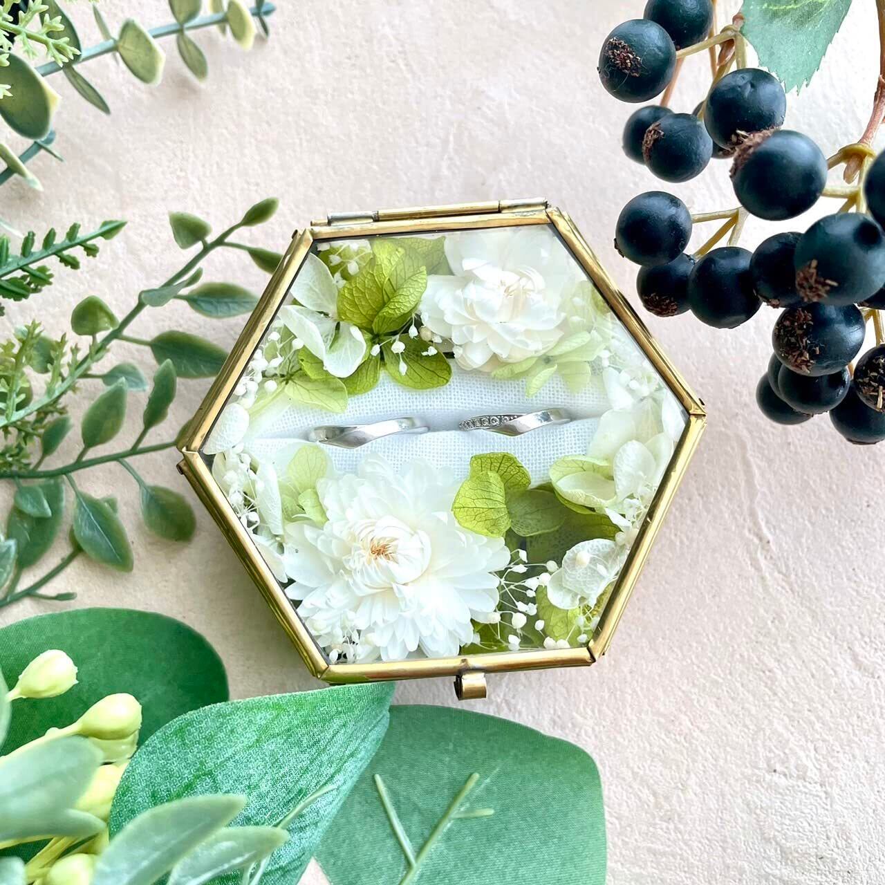 ナチュラルウェディングに ぴったりのリングピローです -------------------------------- *フラワー装飾* グリーンのアイスランドモスを敷きつめ、ホワイト・グリーンのドライフラワーを散りばめました 優しくナチュラルな雰囲気に仕上げており、野花をぎゅっと閉じ込めたような作品です。 -------------------------------- 【リングピローの長所】 ●指輪を抜き差しできる しっかりとした土台 ●指輪を入れたまま蓋を 閉めることができる ●土台に使用しているフィンランドモスが上から見えないくらいたっぷりお花が詰まっている 【MALAIKAガラスケースについて】 ●新品、未使用 ●Lサイズ/長径8cm×短径7cm×厚さ3.7cm ※ガラスケースは全て新品です。職人の手作りのためメッキの色にムラがあったり、歪みがある場合がありますが不良品ではありませんのでご理解ください。 花嫁に人気でなかなか手に入らないようです!