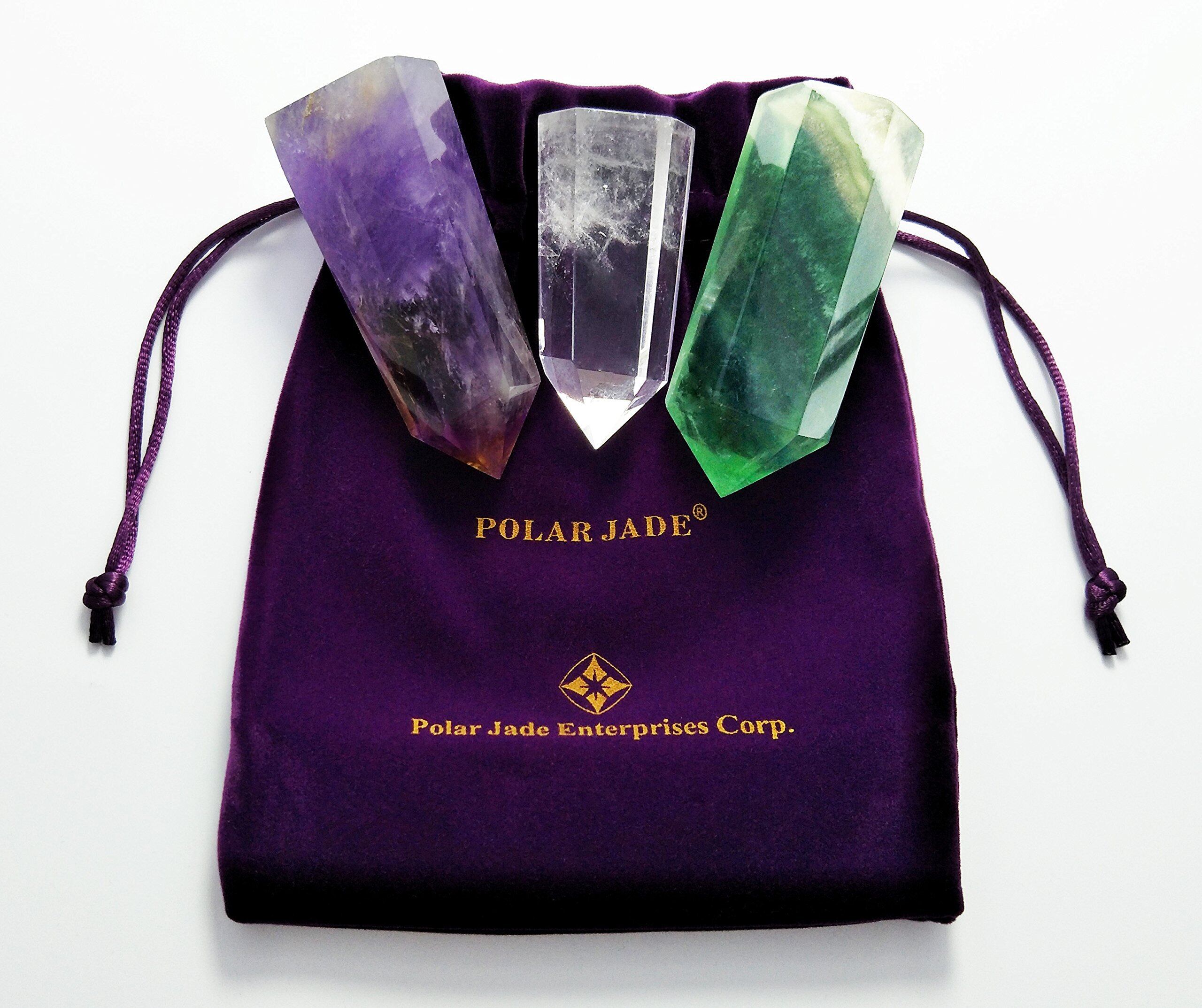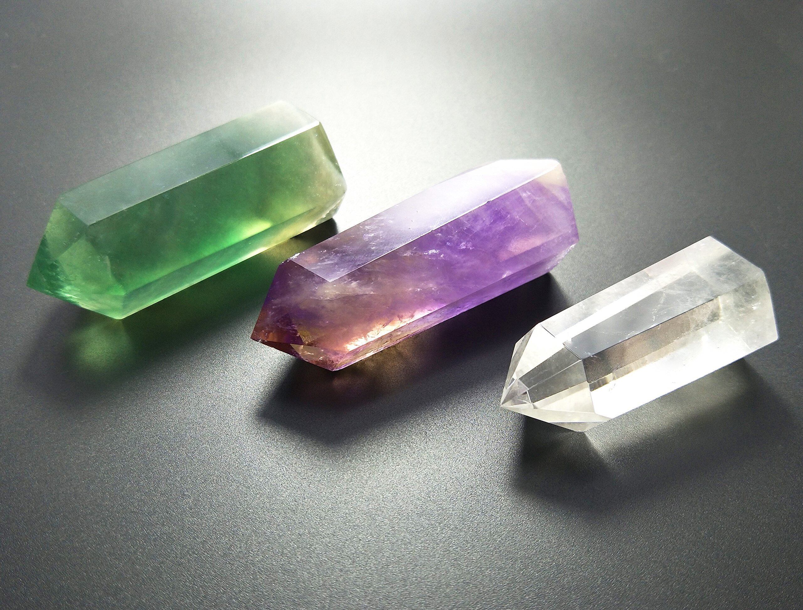 ヒーラーの天然石パワーストーン水晶ヒーリングワンド三枚セット(クリアクォーツ/アメシスト/フローライト蛍石) 先のとがった多面体仕上げ仕様のクリスタル棒で 癒し瞑想とチャクラ強化エネルギーヒーリングなどに最適