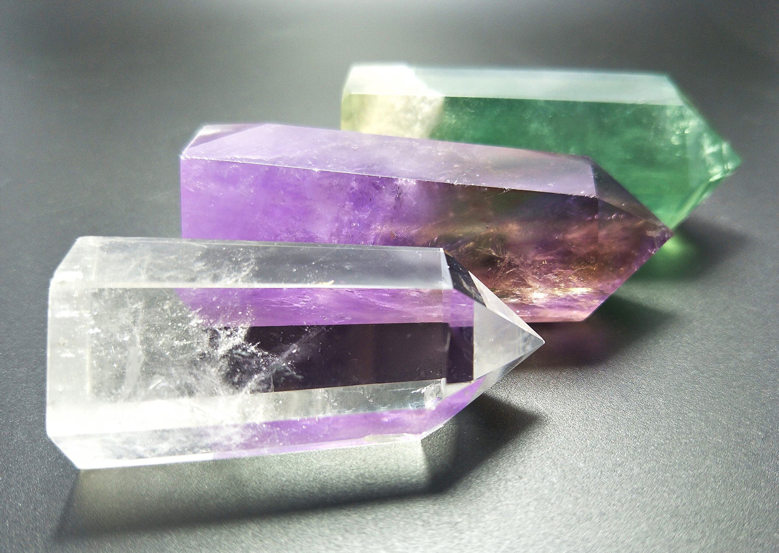 美しいクリスタルワンド3枚セット(クリアクォーツ/アメシスト/蛍石) 、先のとがった六面体仕上げ、長さ50 - 70 mm(クリアクォーツは35 - 55 mm)