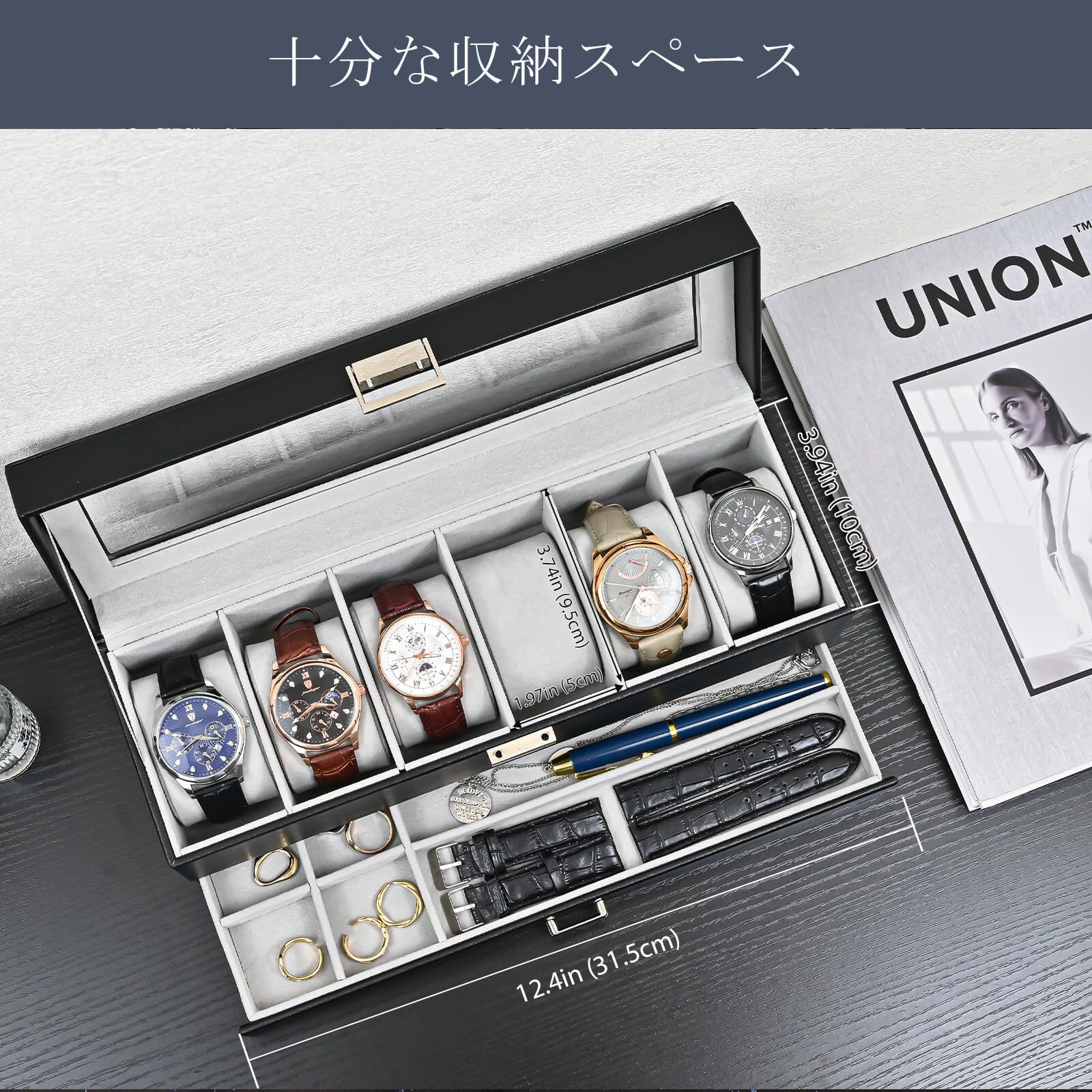 大容量設計:上層には直径 50mm 以内の時計を 6 本収納可能、下層ではバンドや指輪、イヤリング、ネックレスなどの小物も整理できます。