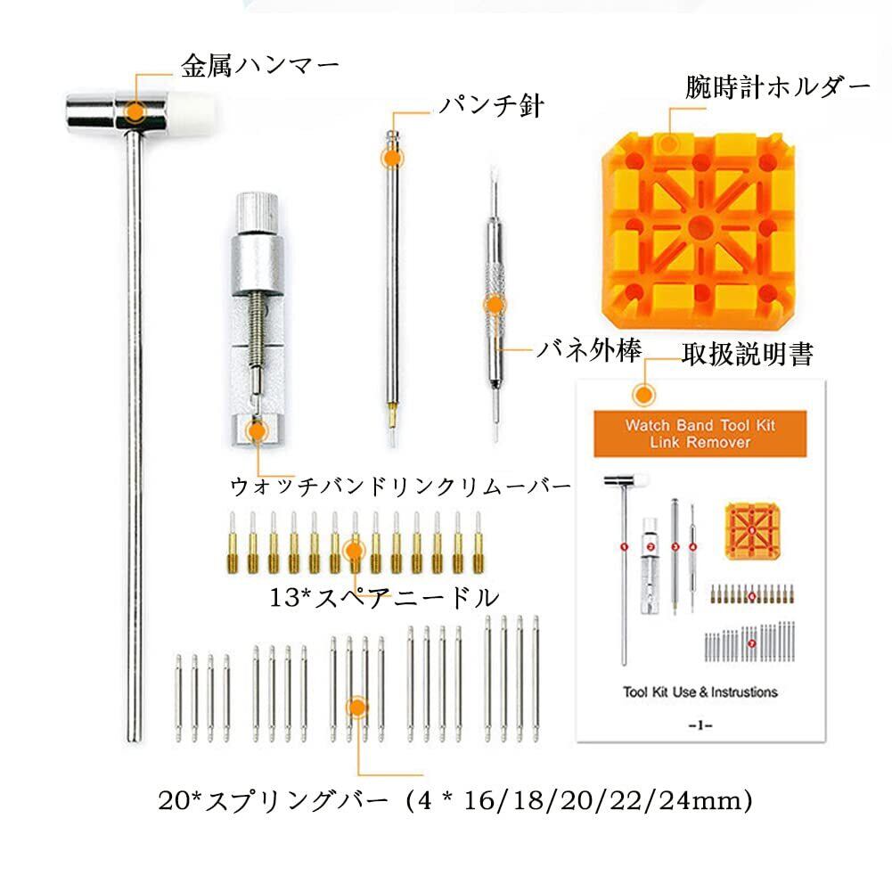 腕時計ベルト交換工具セット内容:金属ハンマー*1 ウォッチバンドリンクリムーバー*1 バネ外棒*1 腕時計ホルダー*1 パンチ針*1 13PCSスペアニードル*1 20PCSの1.5Φスプリングバー(4 * 16/18/20/22/24mm) 取扱説明書*1