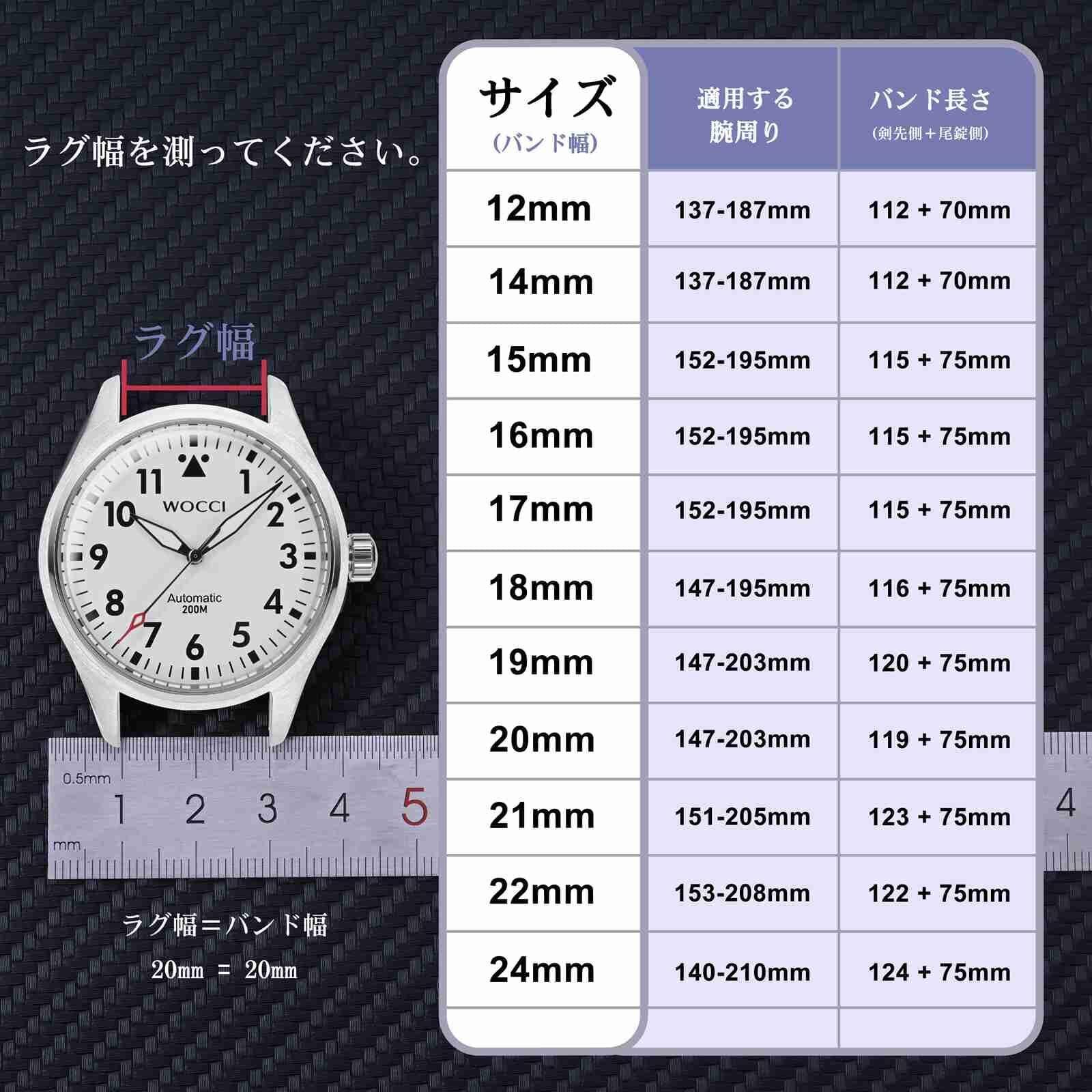 この時計バンドは幅12mm 14mm 15mm 16mm 17mm 18mm 19mm 20mm 21mm 22mm 24mmのバネ棒(スプリングバー)を使う伝統的な腕時計やスマートウォッチに適用します。注文する前に腕時計ダイヤルのラグ幅をご確認ください。