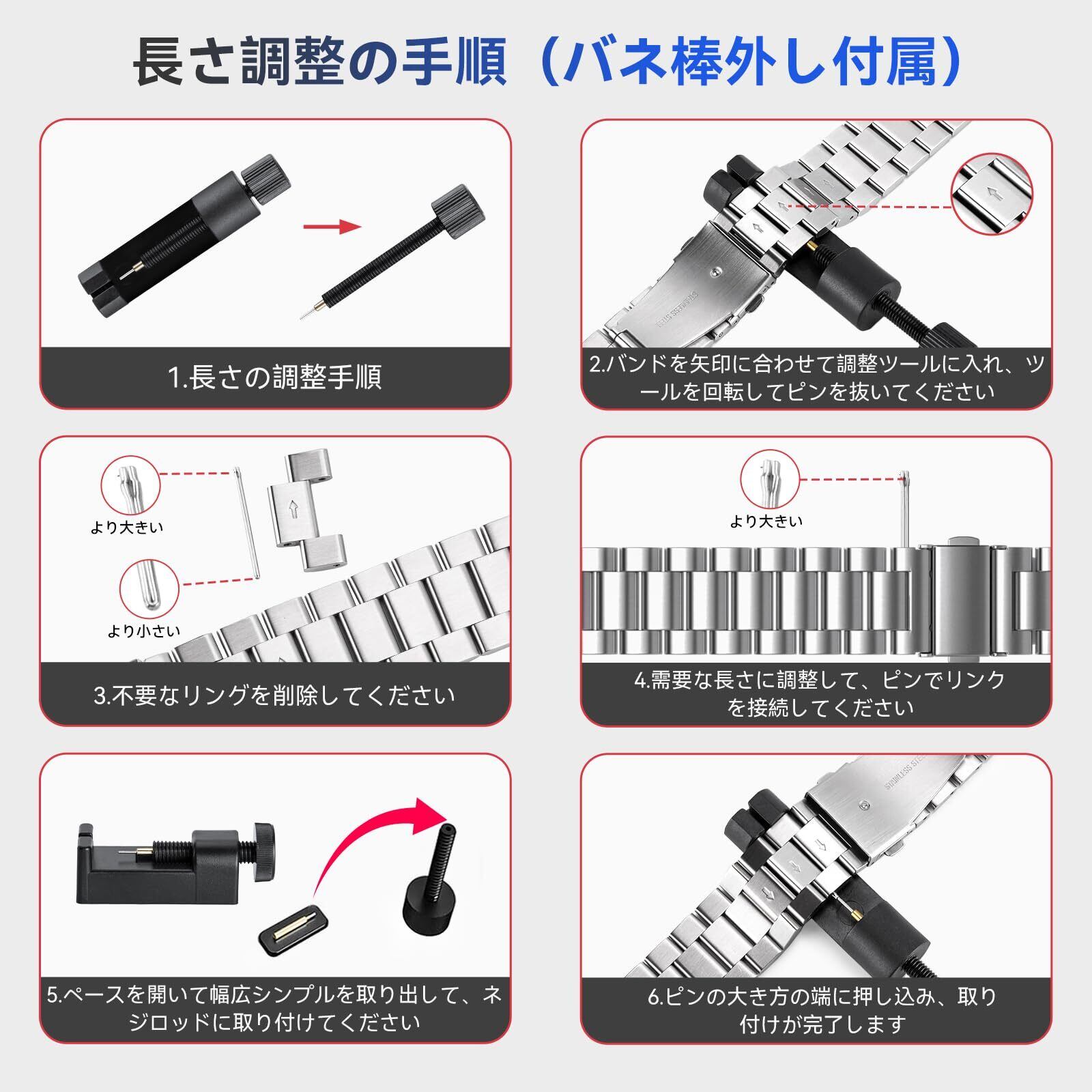 「長さ調整&調整工具付き」:このメタル腕時計ベルトにはクイックリリース技術を利用して、バックルの開閉を楽に出来て、バンドを数秒で装着出来ます。付属したベルト調整専用工具で、お客様の腕に合わせて調整し、最もお似合の長さに変更出来ます。(ツールの使い方が分からないの場合やその他の質問が有るの場合、お気軽に弊社にお問い合わせください、24時間内の返答をご提供致します)