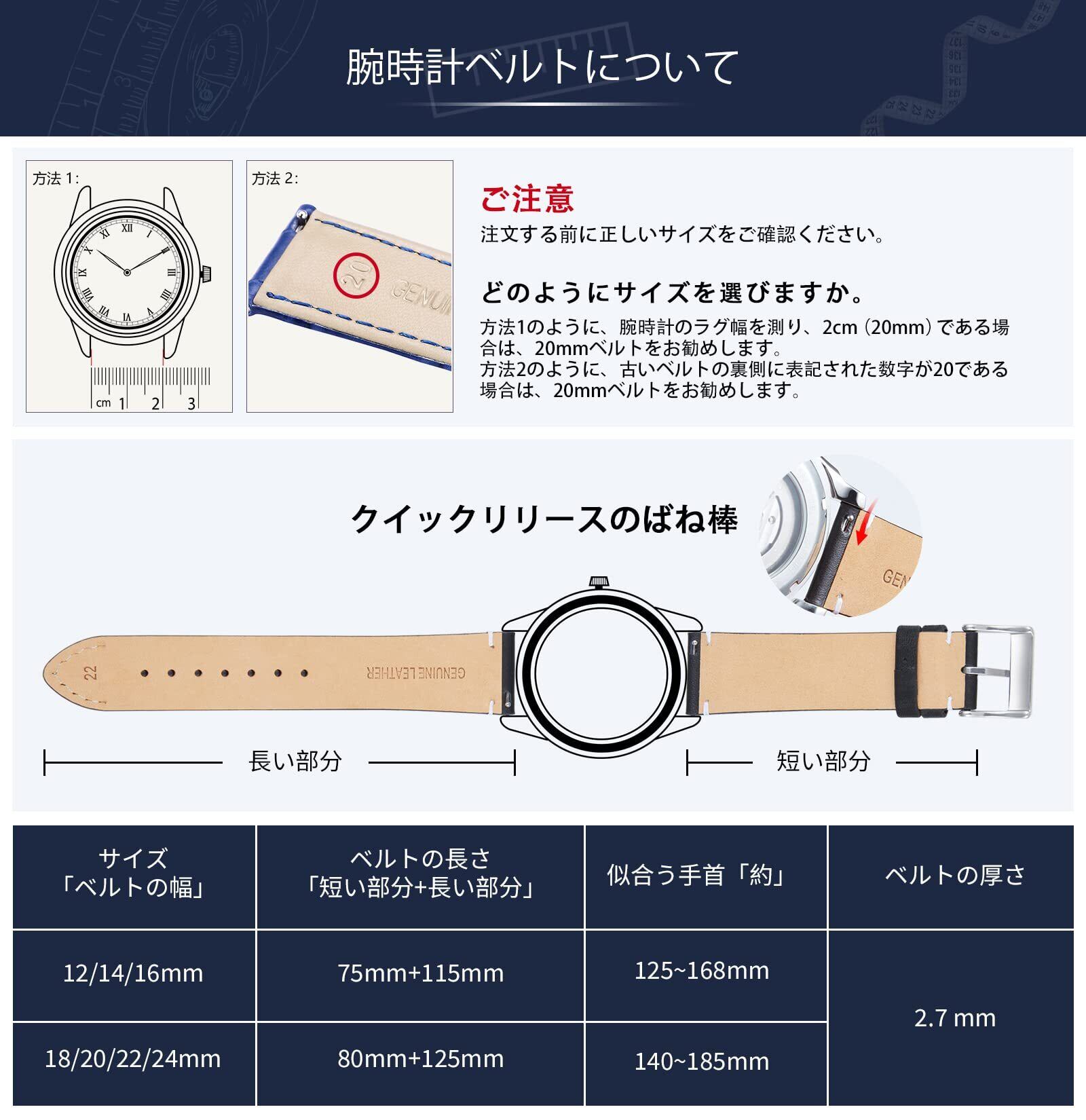 互換性:この時計バンドは12 mm、14 mm、16 mm、18 mm、20 mm、22 mmまたは24 mmのスプリングバーを使用するのクラシックウォッチとスマートウォッチに適用します。ご注文前に、時計のラグ幅を測定してください。