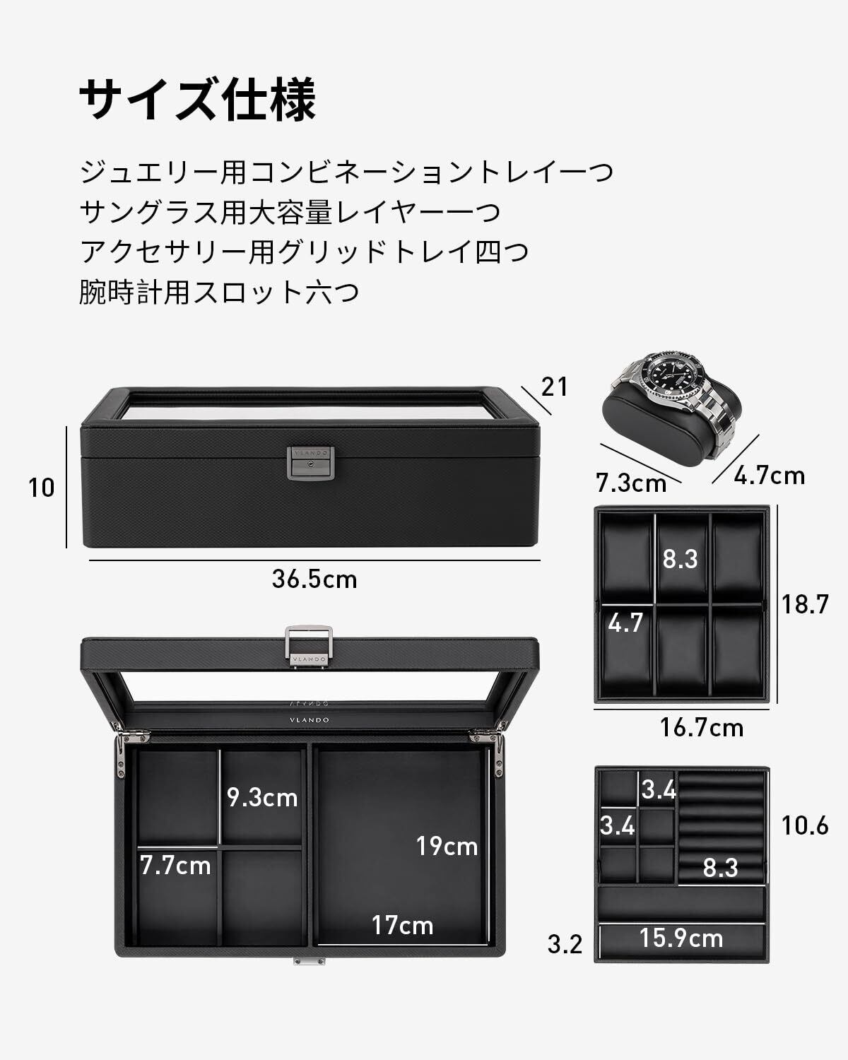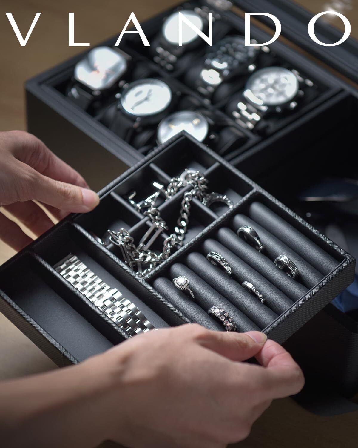 迅速な整理 - 取り外し可能な仕切りでさまざまなアクセサリーをより良く分類します。2段階の時計ケースは、正しいアクセサリーを迅速に見つけ、忙しい朝の時間を節約する手助けをします。