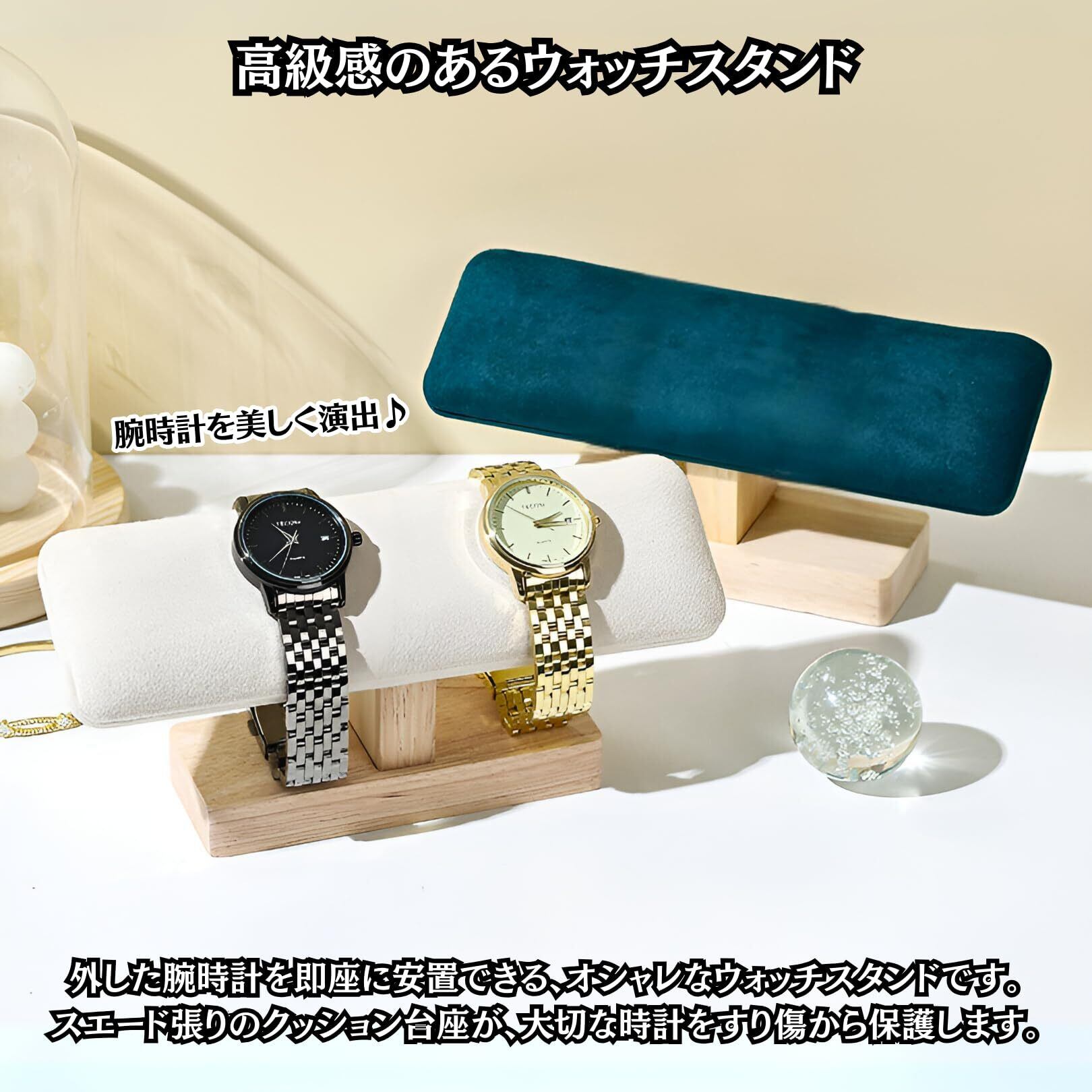 【大切な時計を保護】外した腕時計をすぐに掛けられるウォッチスタンドです。台座は高級感のあるクッション付きのスエード張りとなっており、大事な時計をすり傷からガードします。高級時計店のショーケースさながらに、あなたの時計を美しく演出します。