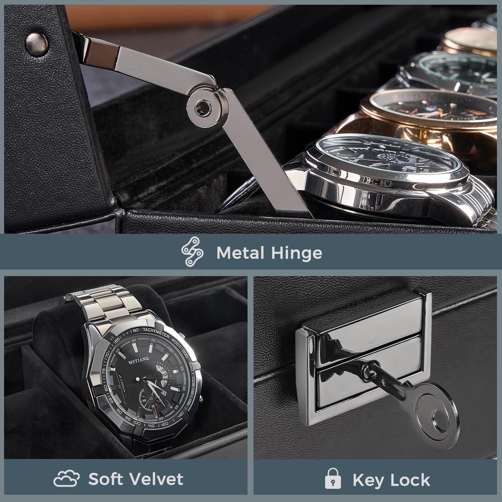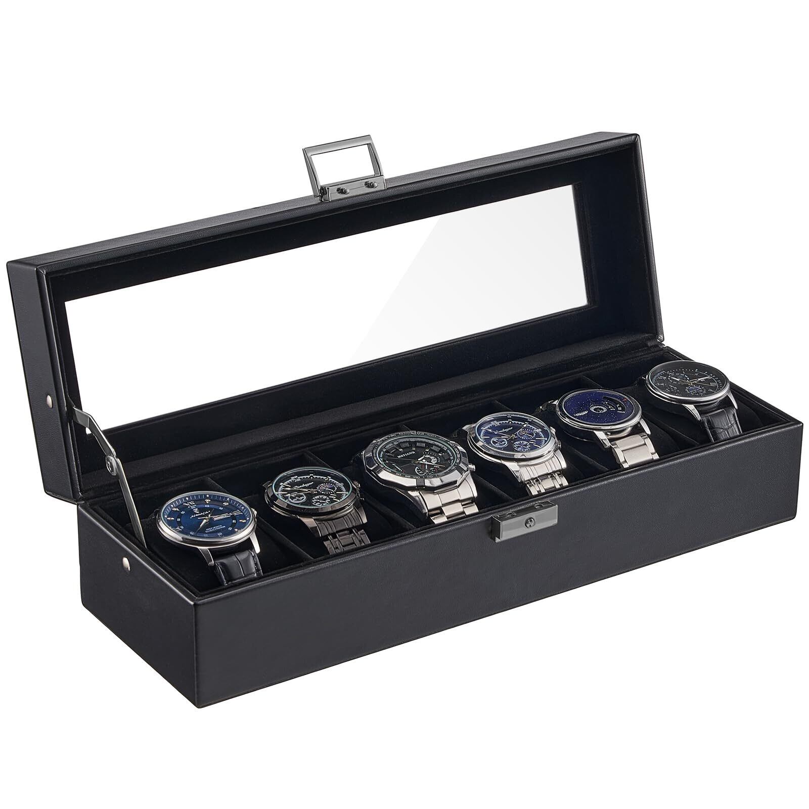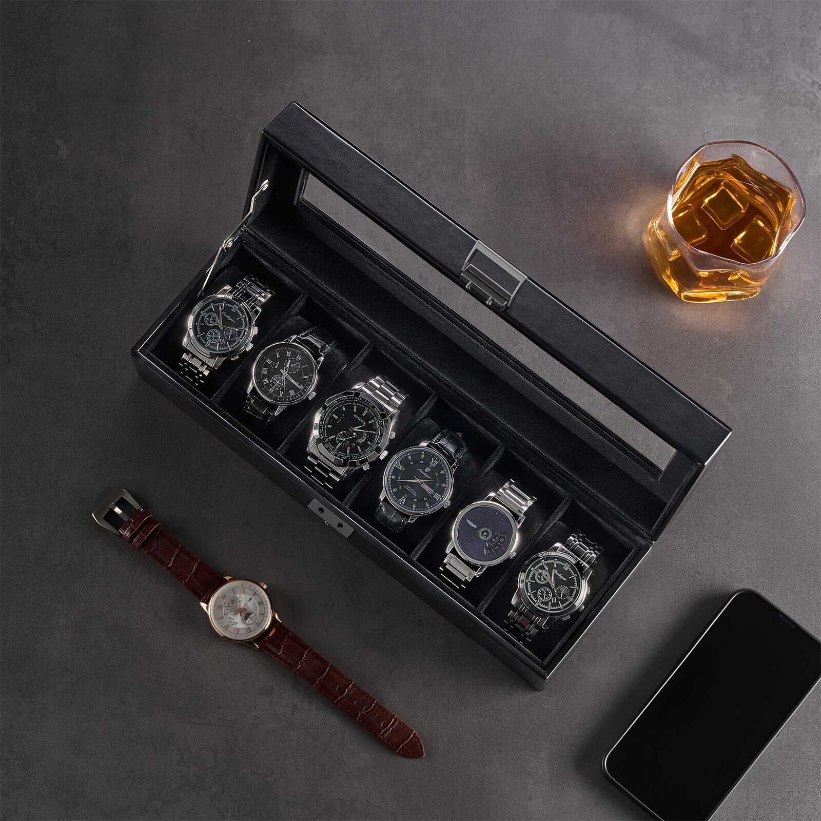 ProCase ウォッチボックス 6スロット メンズ PUレザー ジュエリーオーガナイザー ディスプレイ収納ケース ガラス蓋付き (オールブラック)