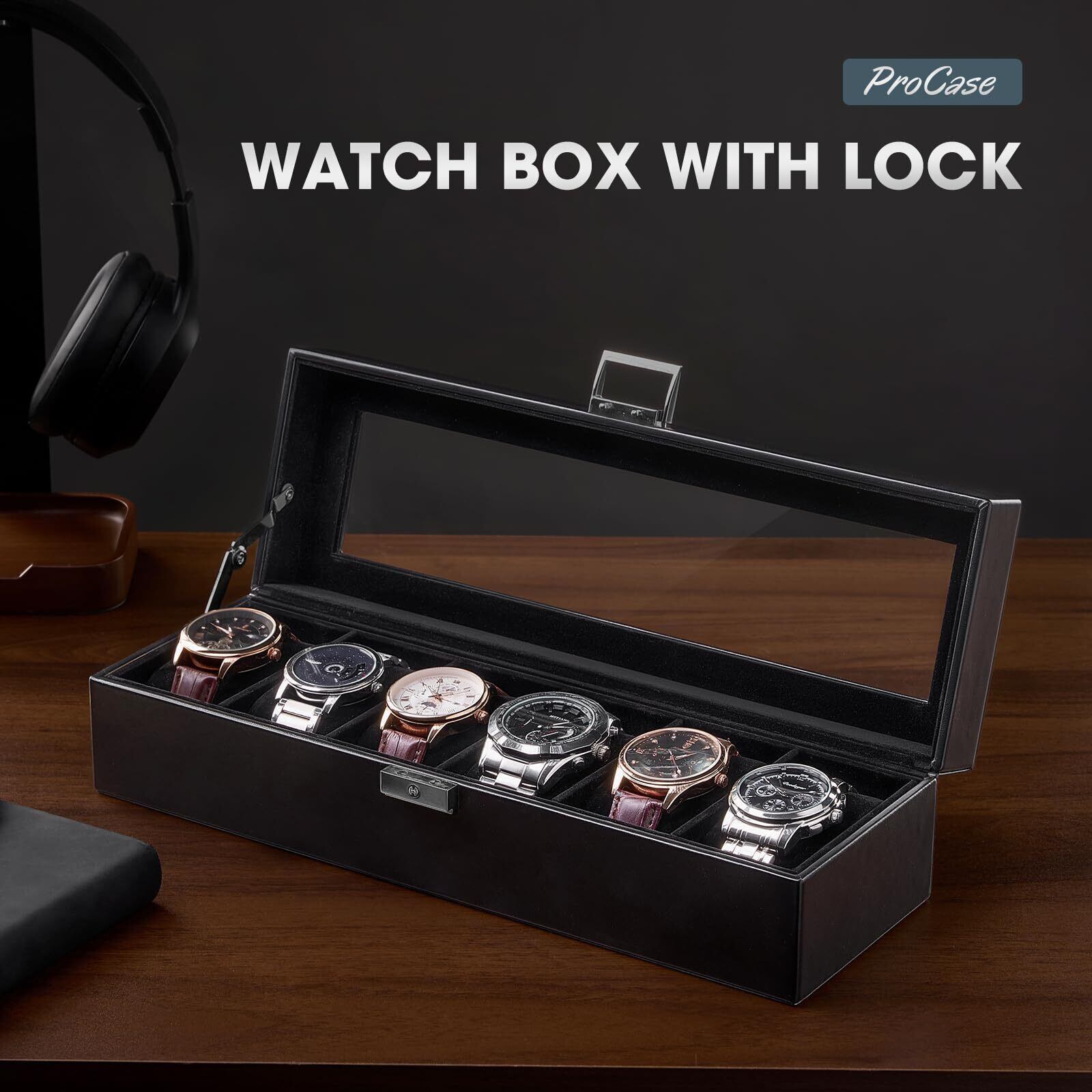 ProCase ウォッチボックス 6スロット メンズ PUレザー ジュエリーオーガナイザー ディスプレイ収納ケース ガラス蓋付き