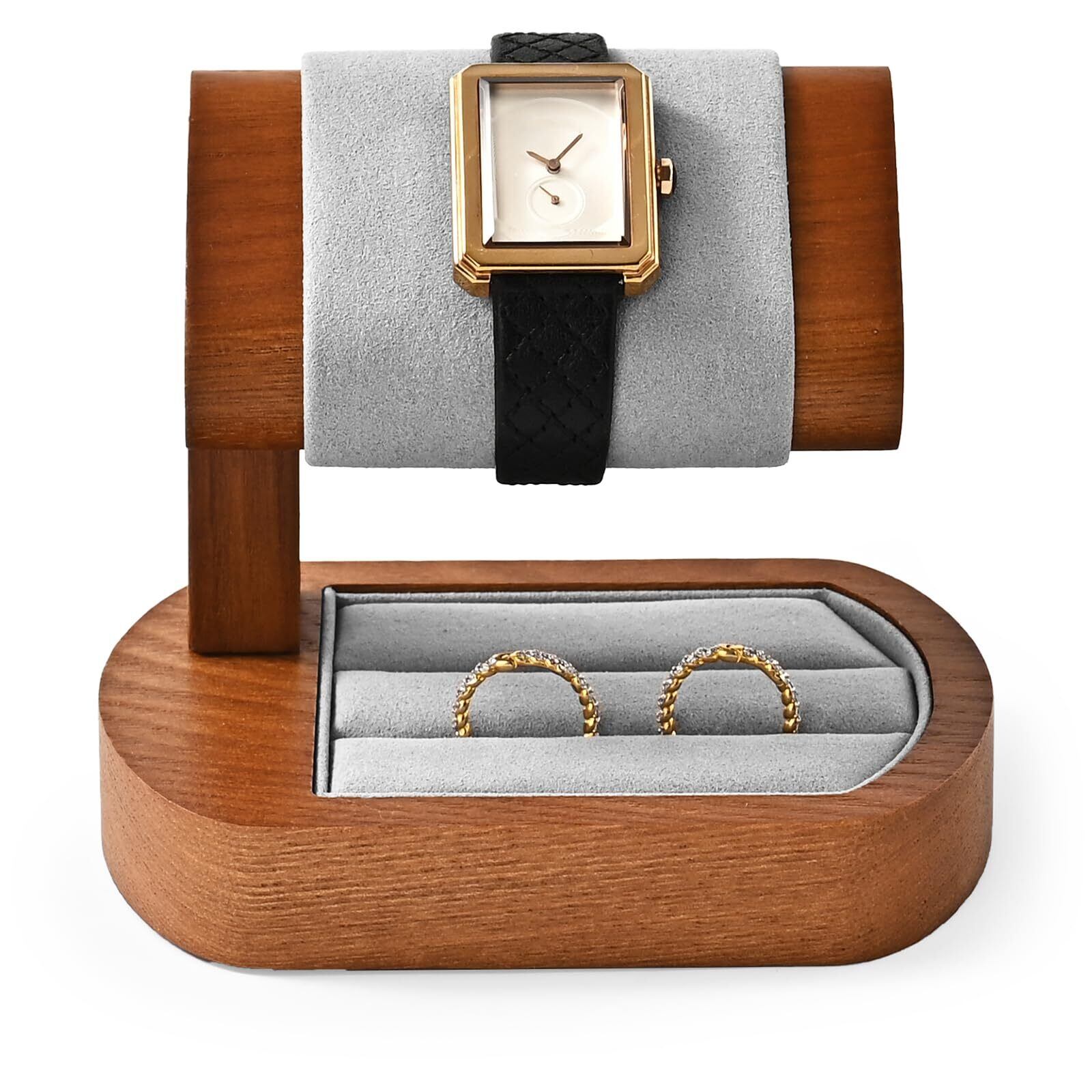 【使い方色々】時計以外にもブレスレット、バングル等も収納できるスタンドです。リングを外した後に紛失しないよう、リング収納スペースもデザインされています。お家のアクセサリーの整理やお店での展示など幅広くご利用いただけます。高級時計店のショーケースながらに、あなたの時計を美しく展示します。