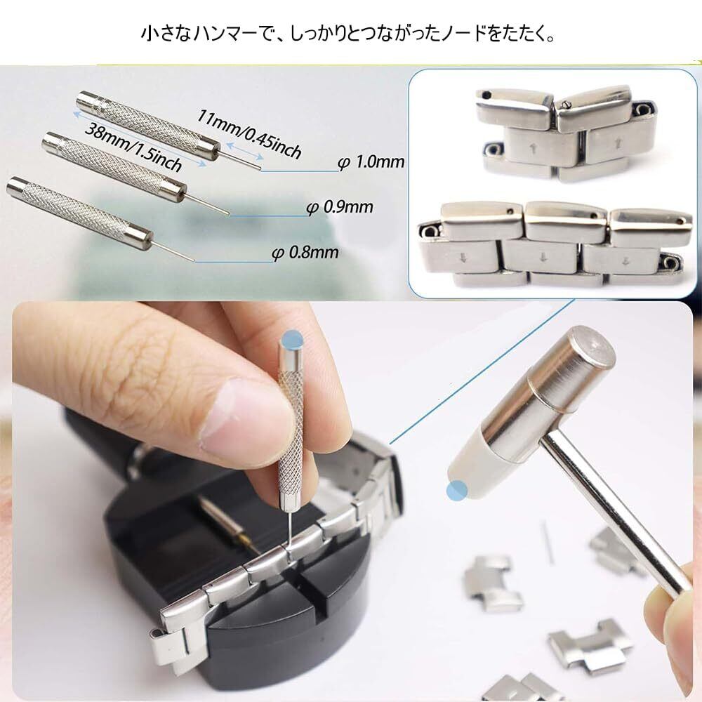 【セット内容】 双頭ハンマー*1、 時計バンドリンクリムーバー*1、スペアニ一ドル*5、パンチ針*3、クリ一ニングクロス*1。