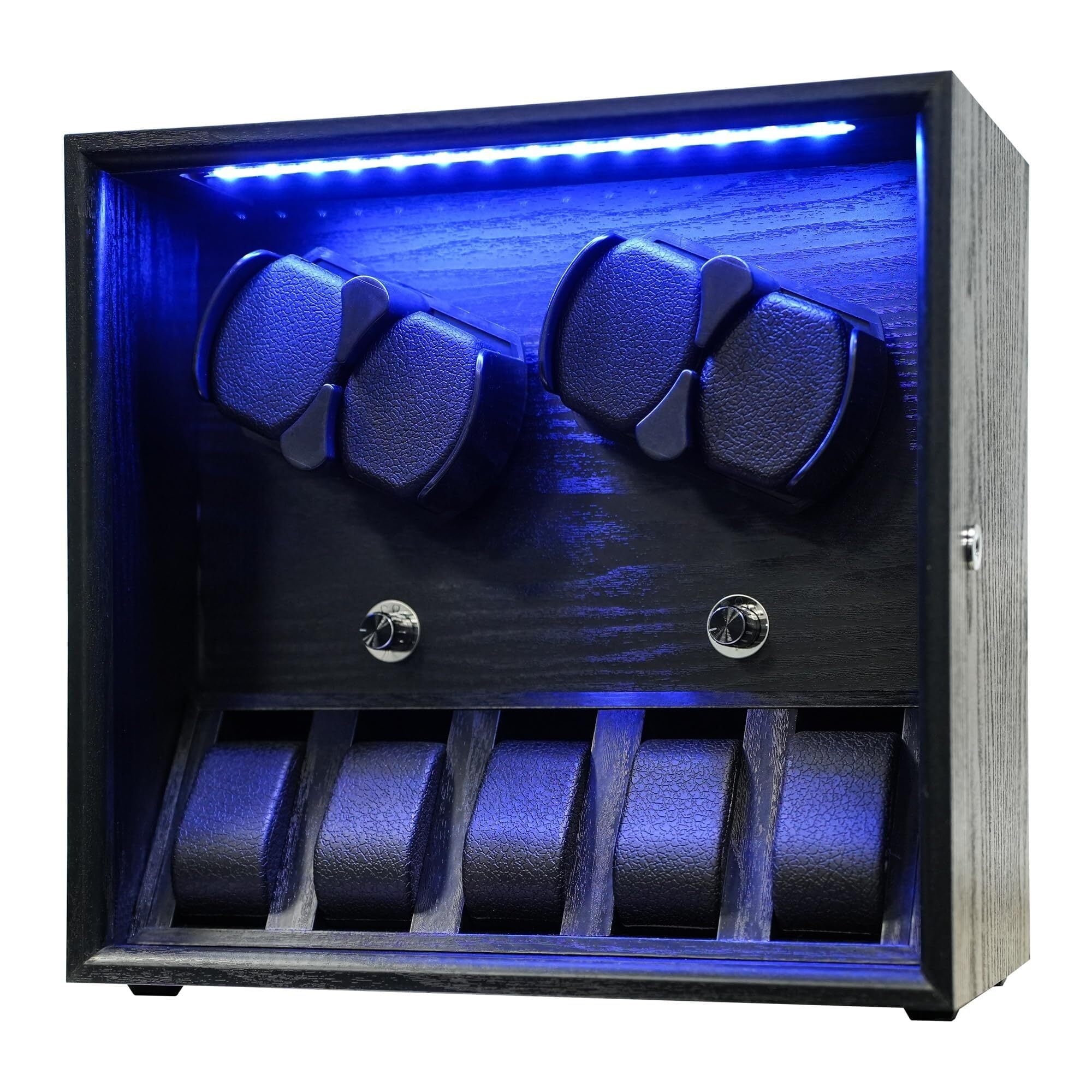 ハイエンドの人気デザイン : 静音設計、防磁設計、動作音が非常に静かなので、寝室や書斎に置くこともおすすめします。4本同時に回転することができ、5本の時計を追加収納することができます。内蔵のLED青い光照明、暗くでも素早く正確に腕時計を入手できます、落ち着いた雰囲気を醸し出します。インターロック機能付き、扉を開いた際ホルダーの回転を自動停止。