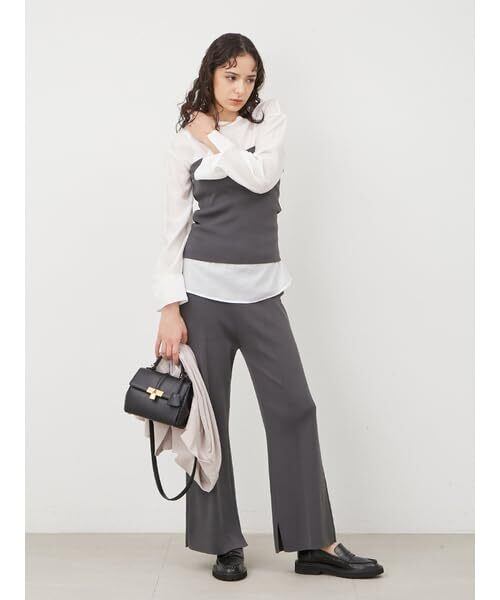 ニットのビスチェとパンツ、インナーの3点を組み合わせた、トレンドのスタイリングが楽しめるセットアイテムです。インナーはシアー感のある素材を使用し、バックの開きとリボンがポイント。ビスチェを着用しても裾から出る長め丈は、腰回りをカバーします。ニットパンツはラインを拾わず、ゆったりと着れるセミフレアシルエットです。それぞれセパレートでも着用でき、お手持ちのアイテムと組み合わせても楽しめる、多用性のあるセットとなっています。